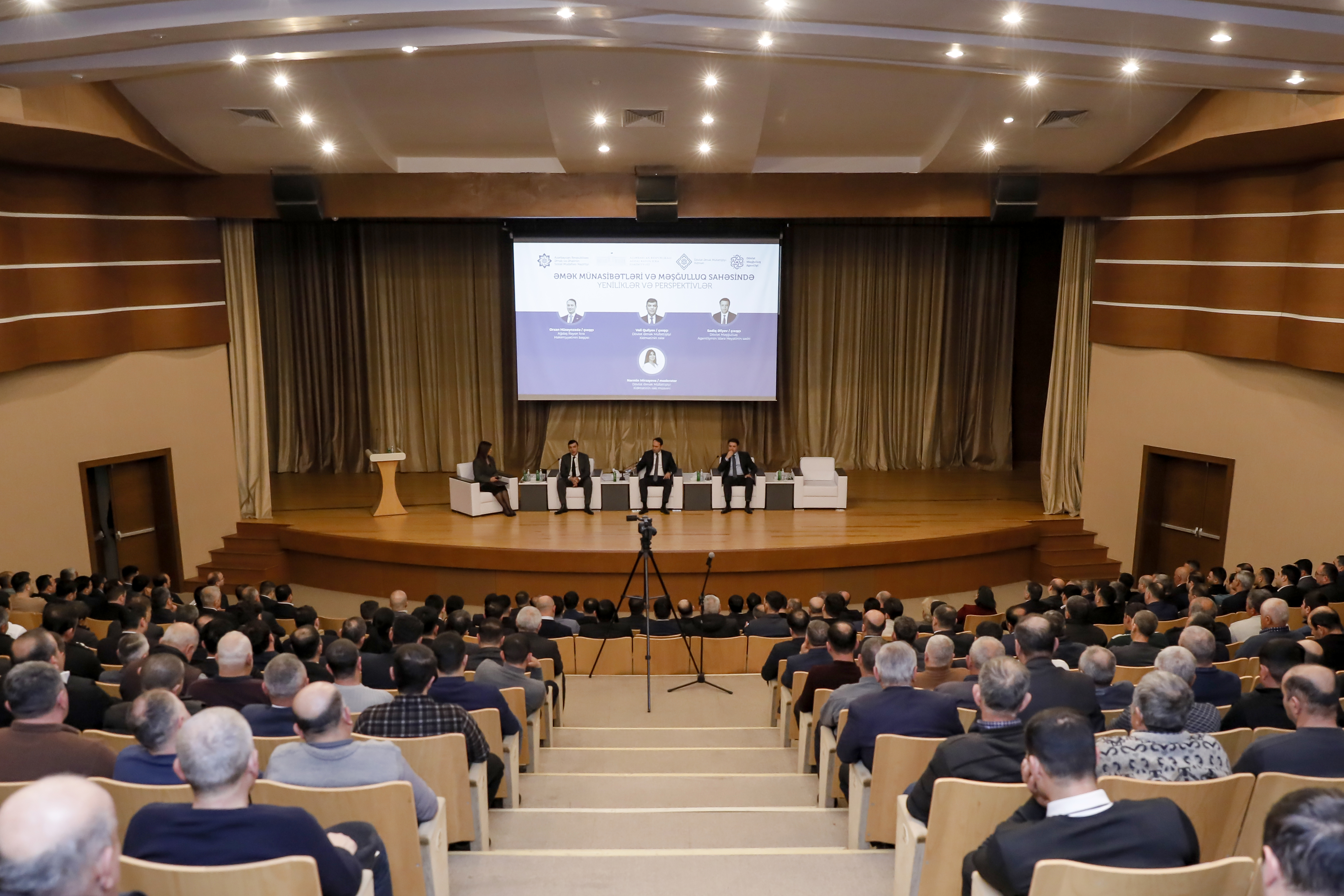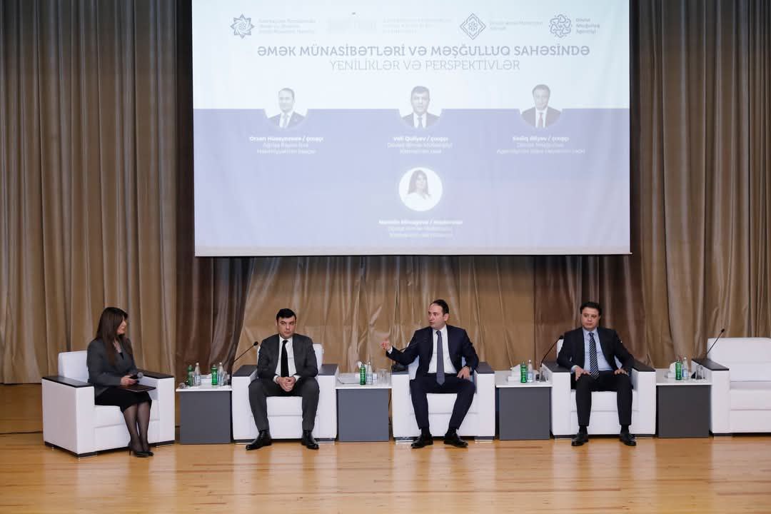 Sonra panel müzakirələr keçirilib. “Əmək münasibətləri və məşğulluq sahəsində yeniliklər və perspektivlər” mövzusunda keçirilən ilk paneldə O.Hüseynzadə, V.Quliyev və S.Əliyev spiker qismində çıxış edib, mövzu ilə bağlı sualları cavablandırıblar.