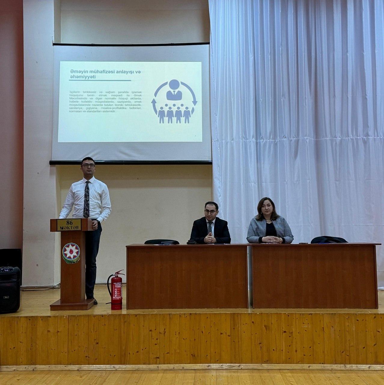 Əmək və Əhalinin Sosial Müdafiəsi Nazirliyi yanında Dövlət Əmək Müfəttişliyi Xidmətinin tabeliyində Əməyin Mühafizəsi Mərkəzinin təşkilatçılığı ilə növbəti tədbir Bakı şəhəri 86 nömrəli tam orta məktəbdə keçirilib.