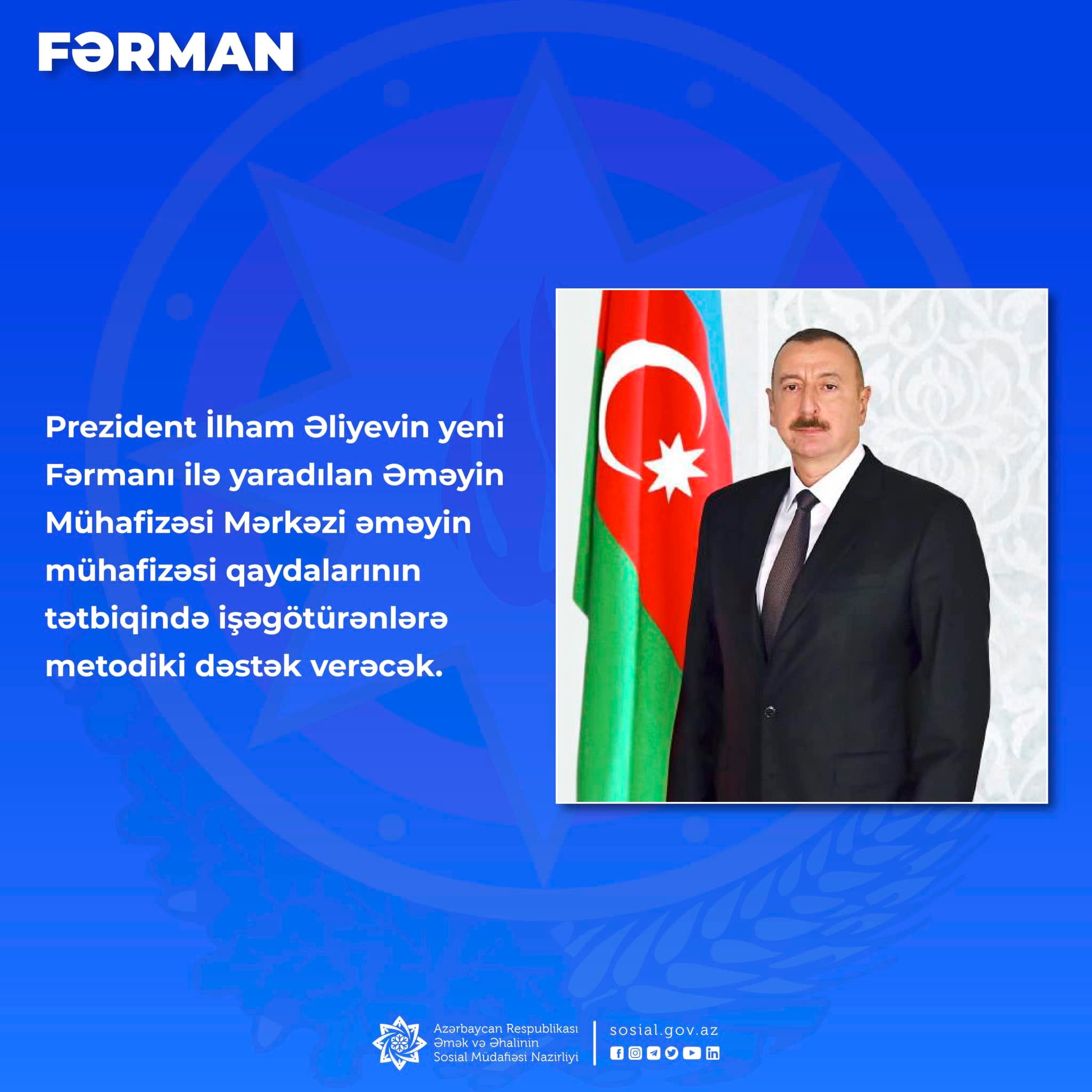 Prezident İlham Əliyevin yeni Fərmanı Əmək və Əhalinin Sosial Müdafiəsi Nazirliyi yanında Dövlət Əmək Müfəttişliyi Xidmətinin fəaliyyətinin optimallaşdırılmasına, həmçinin əməyin mühafizəsi və iş yerlərinin attestasiyasının keçirilməsi sahəsində idarəetmənin təkmilləşdirilməsinə xidmət edir. Fərmanla iki ay müddətində Dövlət Əmək Müfəttişliyi Xidmətinin mərkəzi laboratoriyasının əsasında Xidmətin tabeliyində olmaqla “Əməyin Mühafizəsi Mərkəzi” publik hüquqi şəxsi yaradılacaq və bu barədə dövlət başçısına məlumat veriləcək. Mərkəz işəgötürənlərə əməyin mühafizəsi və iş yerlərinin attestasiyası sahələrində xidmətlər göstərəcək, eləcə də bu sahələrdə təlimlər keçirəcək. İşəgötürənlərə əmək hüquqları, əməyin mühafizəsi və əməyin təhlükəsizliyi sahəsində məsləhət xidmətləri verilməsini, metodiki dəstəyi təmin edəcək. Mərkəzin saxlanma xərcləri və fəaliyyəti Dövlət Əməyin Mühafizəsi Fondundan ayırmalar, fəaliyyətindən əldə edilən gəlir və qanunla qadağan olunmayan digər mənbələrdən maliyyələşdiriləcək.