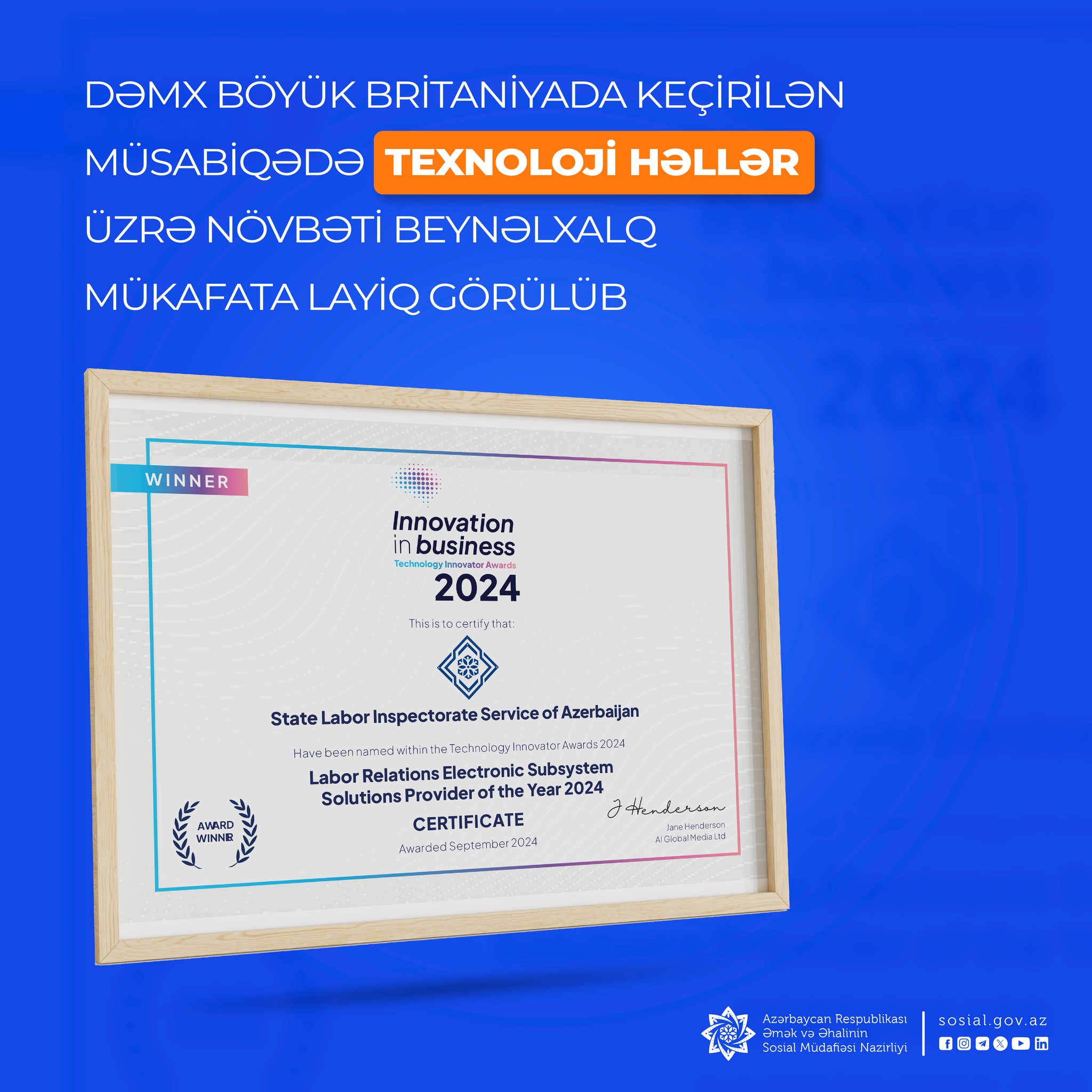 Qurum bu dəfə Böyük Britaniyanın “Innovation in Business” təşkilatının 2024-cü il üzrə "Texnoloji İnnovator” müsabiqəsində "2024-cü ilin Əmək Münasibətləri Elektron Altsistem Həlləri Təminatçısı" adına layiq görülüb.