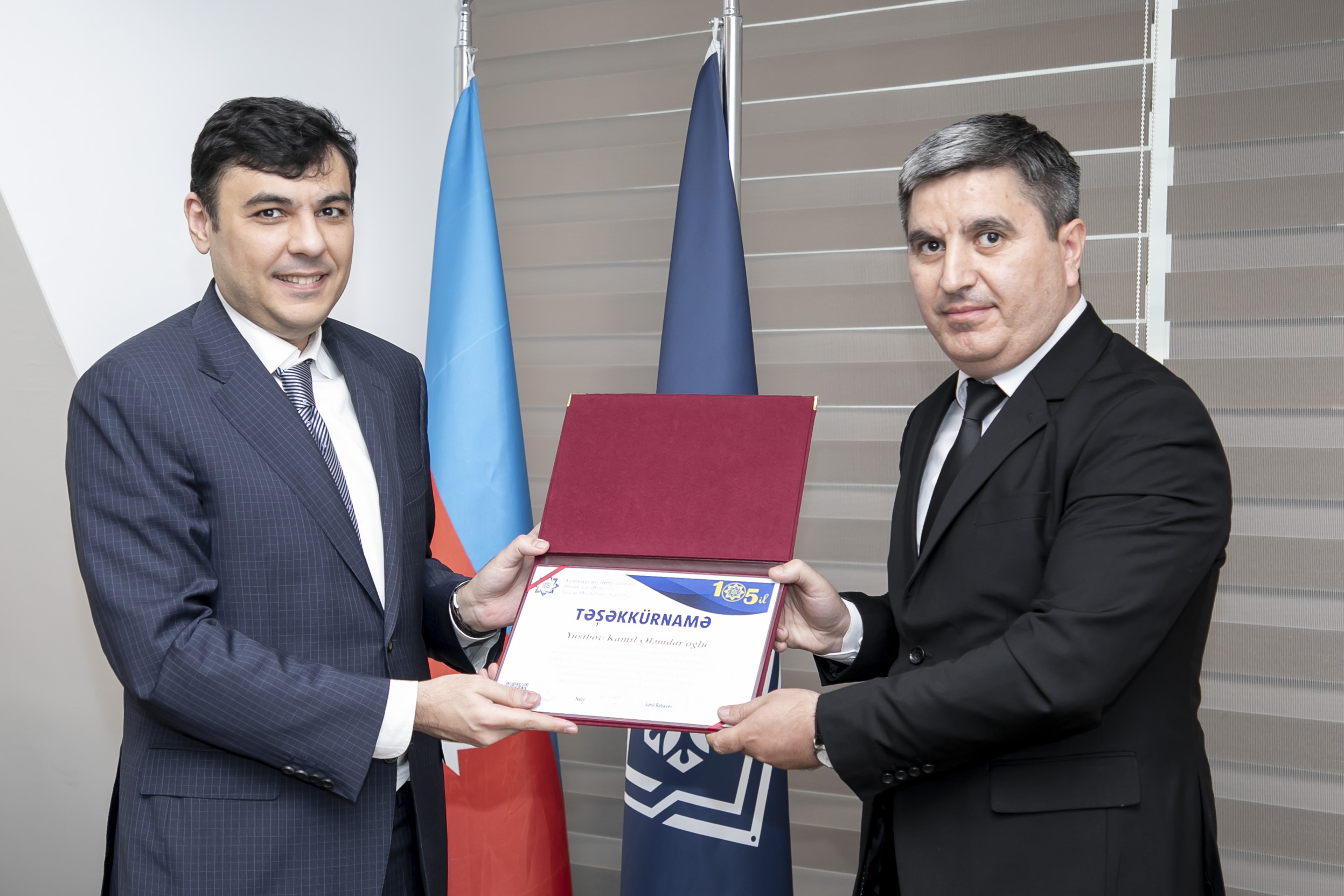“Azərbaycan Respublikası Əmək və Əhalinin Sosial Müdafiəsi Nazirliyinin yaranmasının 105 illiyi münasibətilə və Nazirliyin fəaliyyət istiqamətləri üzrə səmərəli fəaliyyətinə, əhalinin sosial müdafiəsi, əmək, məşğlluq, pensiya reablitasiya sahələrində dövlət siyasətinin həyata keçirilməsində aktiv iştirakına görə” təltif edilənlər Abdullayev Mehman İsrayıl oğlu, Səlimova Təranə Adil qızı, Xaspoladov İsmət Qərib oğlu, Miriyev Hafiz Niftalı oğlu, Məmmədova Nərmin Arif qızı, Babayev Ənvər Niyaz oğlu, Məmmədov Məmməd Süleyman oğlu, Yusibov Kamil Ələmdar oğlu, Sultanov Amin Nizam oğludur.