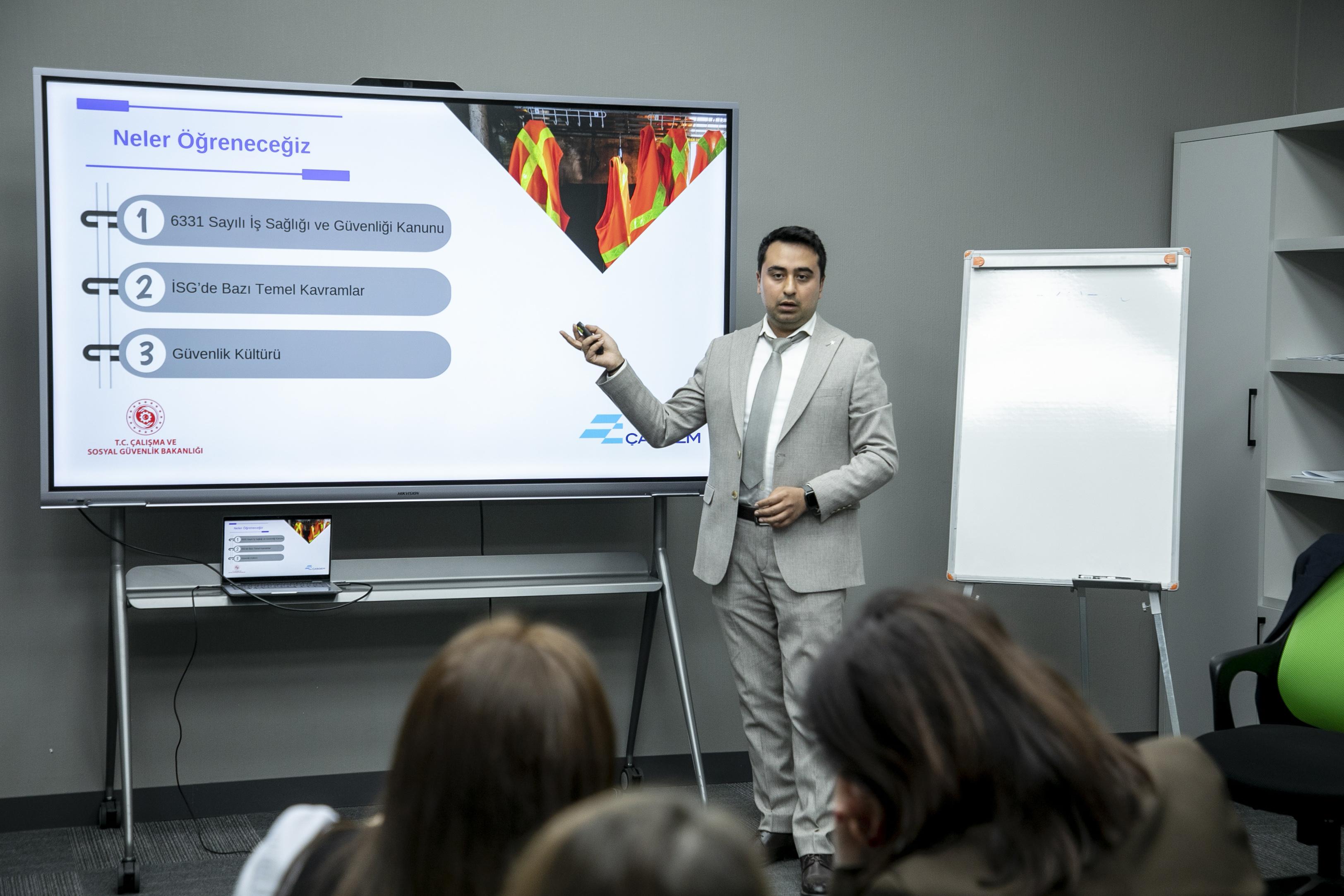 Təlim proqramı iki mərhələdən ibarətdir. Birinci mərhələdə ÇASGEM-in ekspertləri Burak Ayan və Hasan Ali Yaşa tərəfindən təqdimatlar keçirilib. Təlim iştirakçılarına “Təhlükəsiz və sağlam əmək şəraiti”, “Əməyin mühafizəsi üzrə əsas anlayışlar”, “Əməyin mühafizəsi üzrə Türkiyə qanunvericiliyi və tətbiq edilən standartlar”, “Fərdi mühafizə vasitələri və istifadə müddətləri”, “Yükqaldırma işləri”, “Dəzgahlarla iş”, “Əllə yükqaldırma zamanı yaranan əzələ-skelet narahatlıqları və risklər” və digər mövzular üzrə bilik və bacarıqlar aşılanıb.
