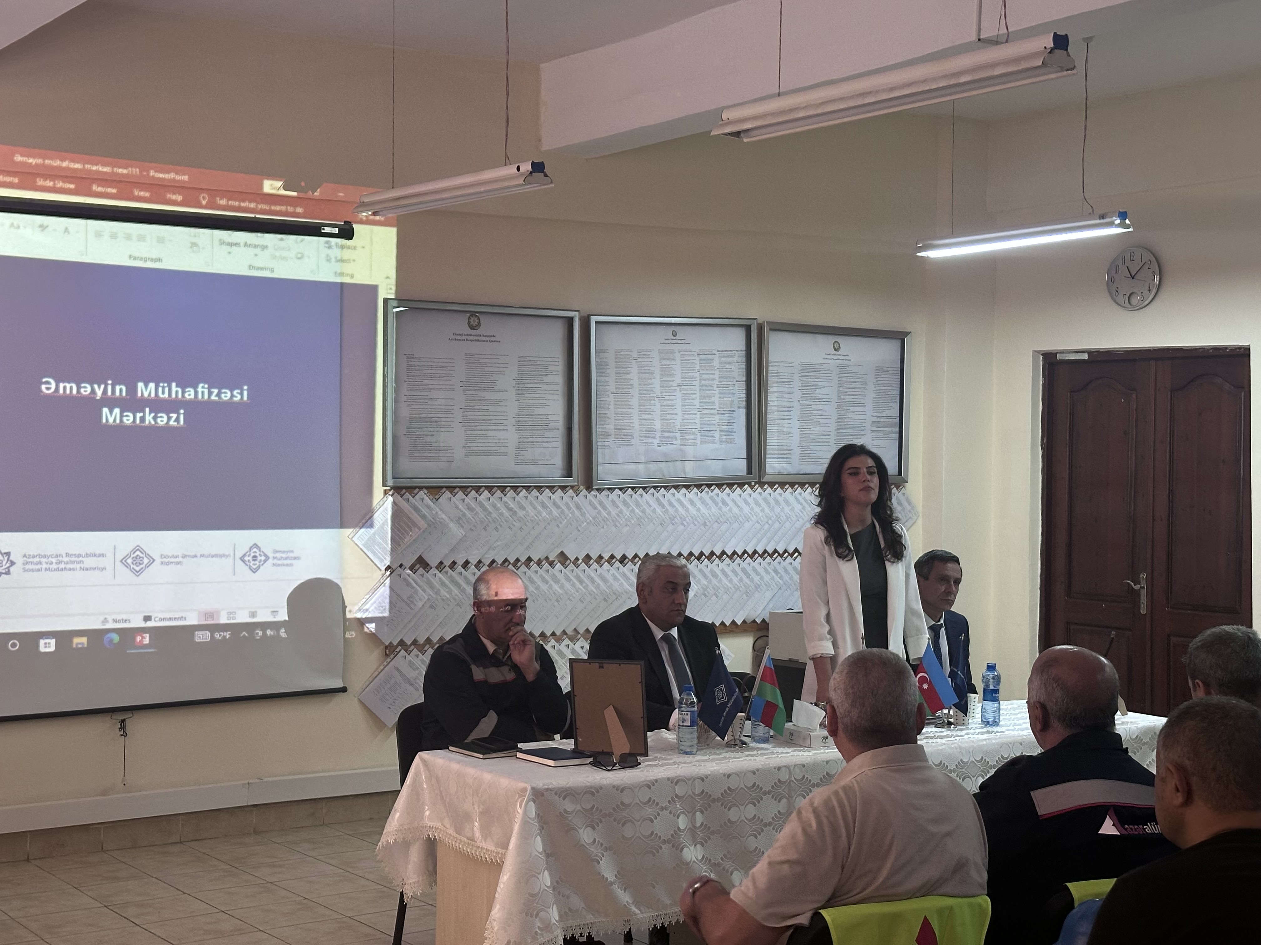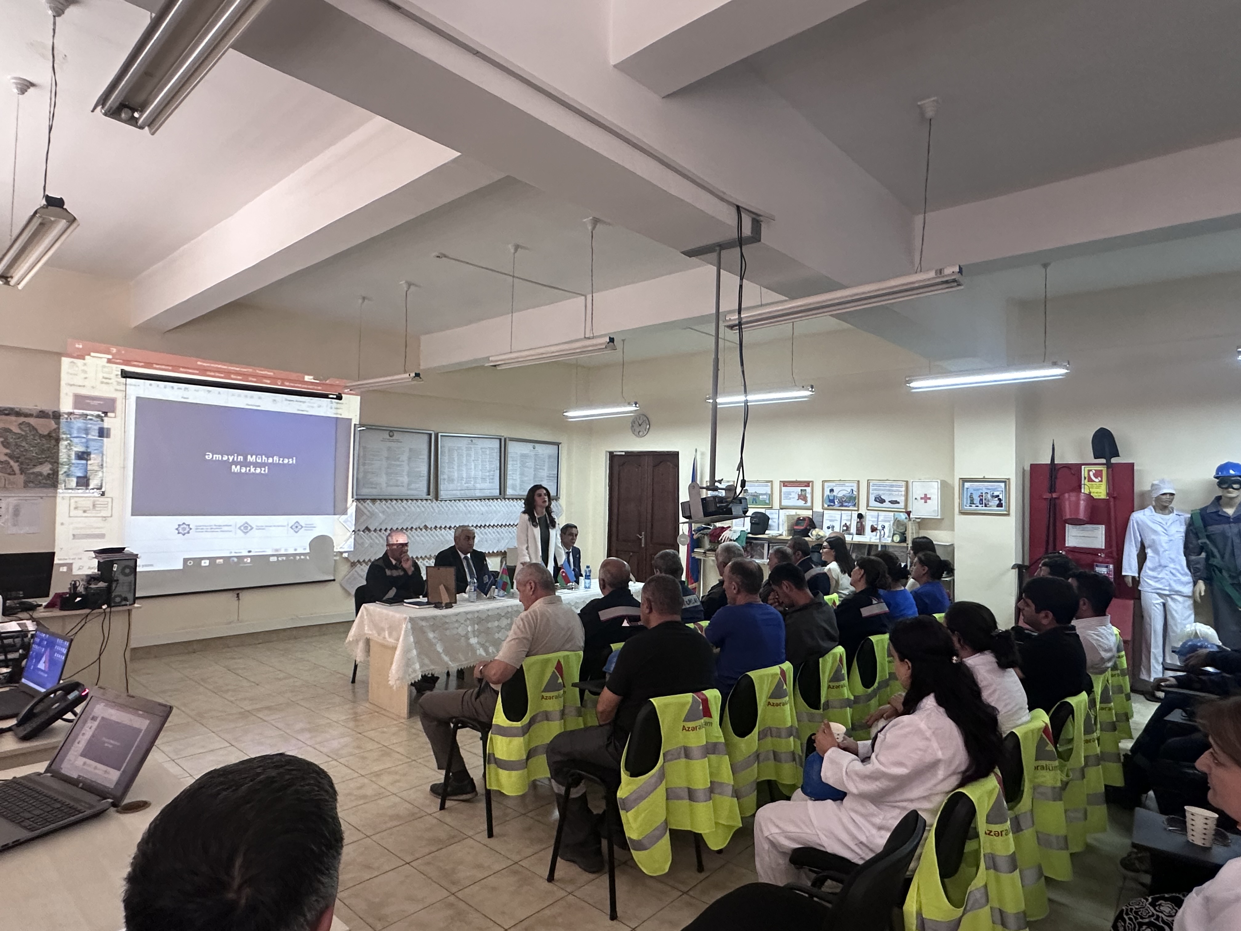 Əməyin Mühafizəsi Mərkəzinin əməkdaşı çıxış edərək, Mərkəzin fəaliyyət istiqamətləri və əməyin mühafizəsi sahəsində görülən işlər barədə məlumat verib. O, müəssisələrdə əməyin mühafizəsi üzrə standart, norma və qaydaların tətbiqinə göstərilən dəstəyi vurğulayıb və yeni qəbul edilmiş standartlarla bağlı iştirakçıları məlumatlandırıb.