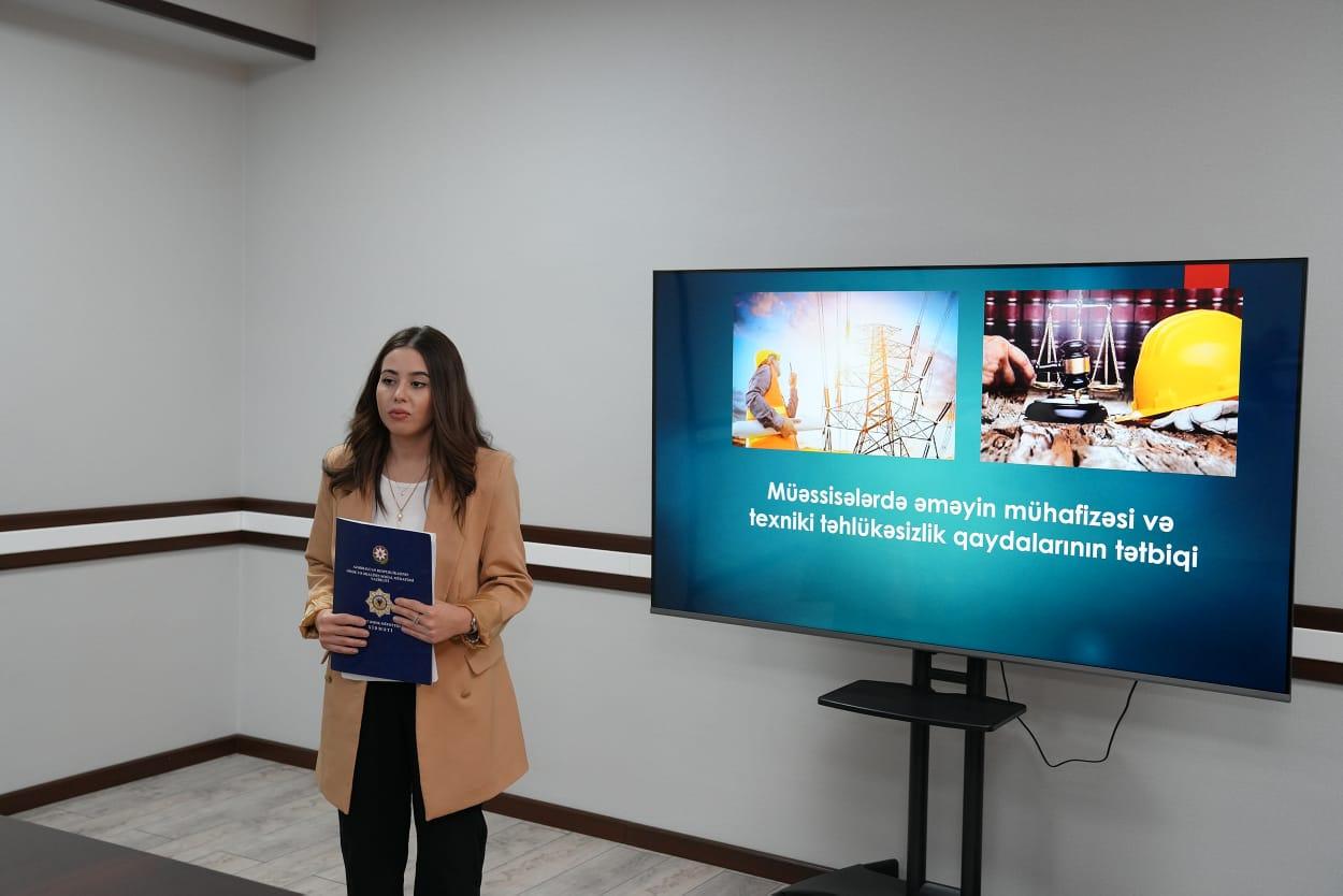 Maarifləndirici görüşdə Xidmətin və Mərkəzin əməkdaşları təqdimatlarla çıxış edərək iştirakçılara işçilərin əməyinin mühafizəsi, onlar üçün sağlam və təhlükəsiz əmək şəraitinin yaradılması ilə bağlı ətraflı məlumat veriblər.