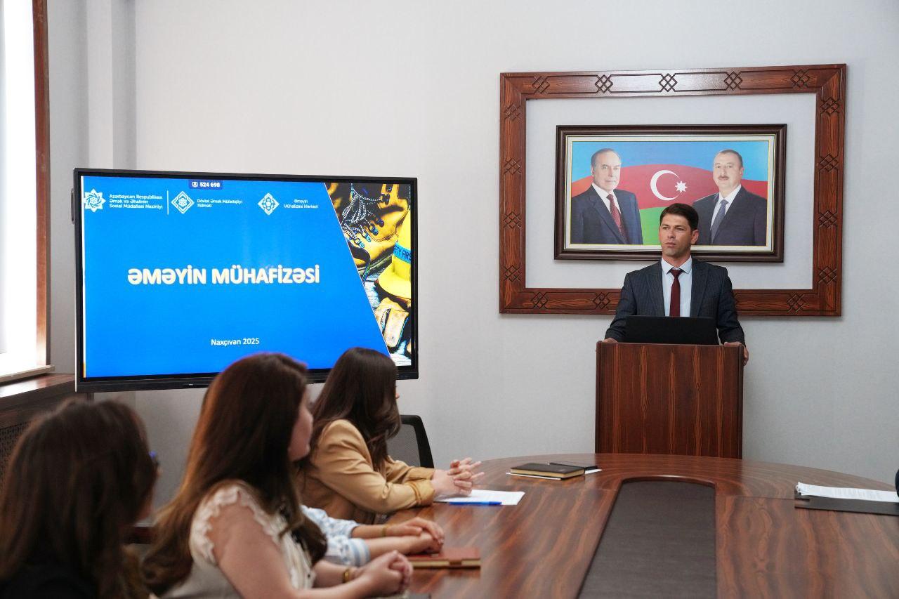 Naxçıvan Muxtar Respublikasında “Analığın mühafizəsi, qadınların əmək hüquqları, gender bərabərliyi” və “İş yerlərində əməyin mühafizəsi” mövzularında maarifləndirici tədbir təşkil olunub. Tədbir Naxçıvan Muxtar Respublikasının Əmək və Əhalinin Sosial Müdafiəsi Nazirliyi yanında Dövlət Əmək Müfəttişliyi Xidməti və Əməyin Mühafizəsi Mərkəzinin Naxçıvan filialının birgə təşkilatçılığı ilə keçirilib.