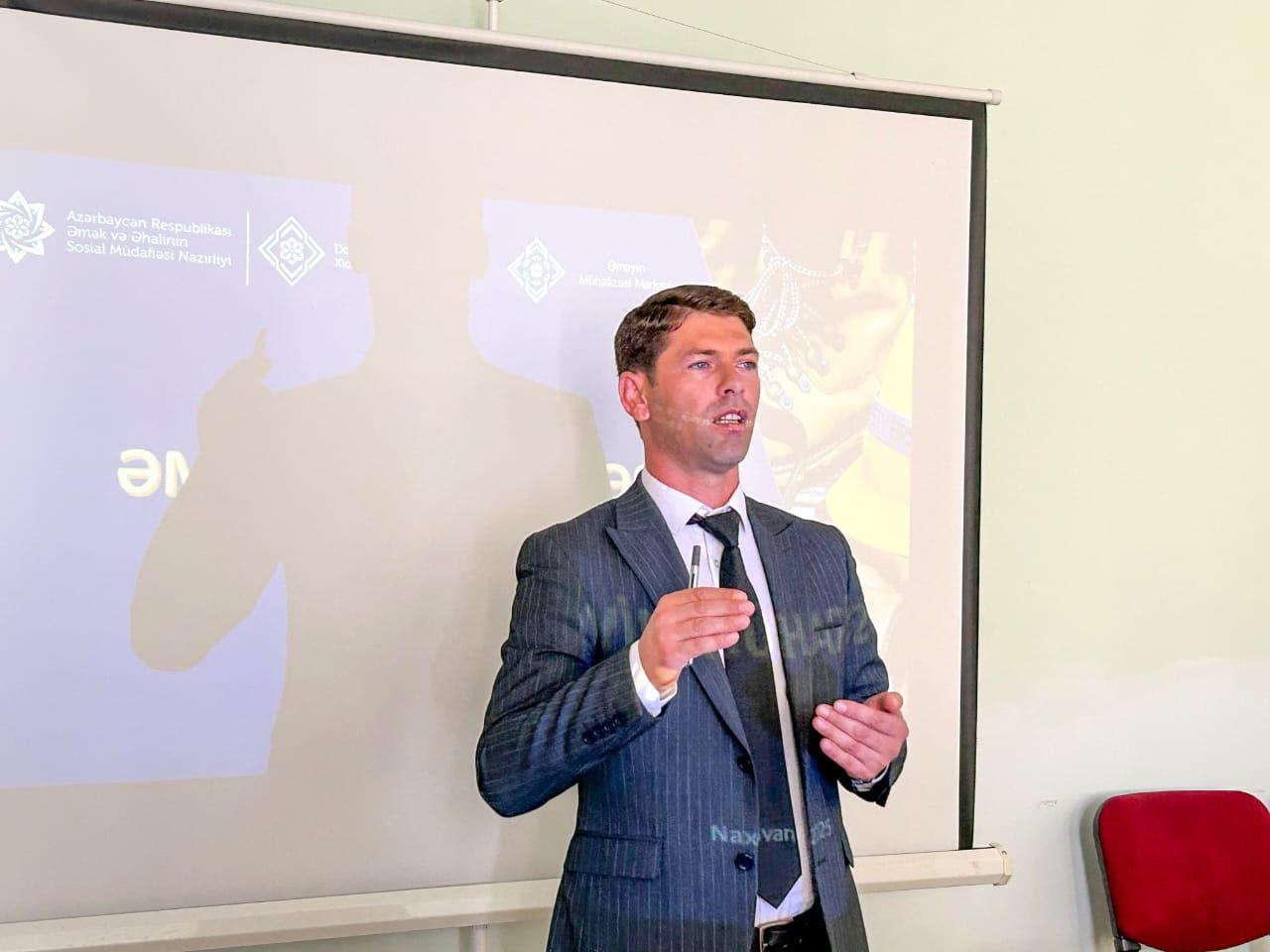 Dövlət Əmək Müfəttişliyi Xidmətinin tabeliyində fəaliyyət göstərən Əməyin Mühafizəsi Mərkəzinin Naxçıvan filialı Culfa Rayon İcra Hakimiyyəti və Muxtar Respublikanın Dövlət Əmək Müfəttişliyi Xidməti ilə birgə işəgötürənlər üçün “Əməyin mühafizəsi, texniki təhlükəsizlik və iş yerlərinin attestasiyası” mövzusunda təlim təşkil edib.