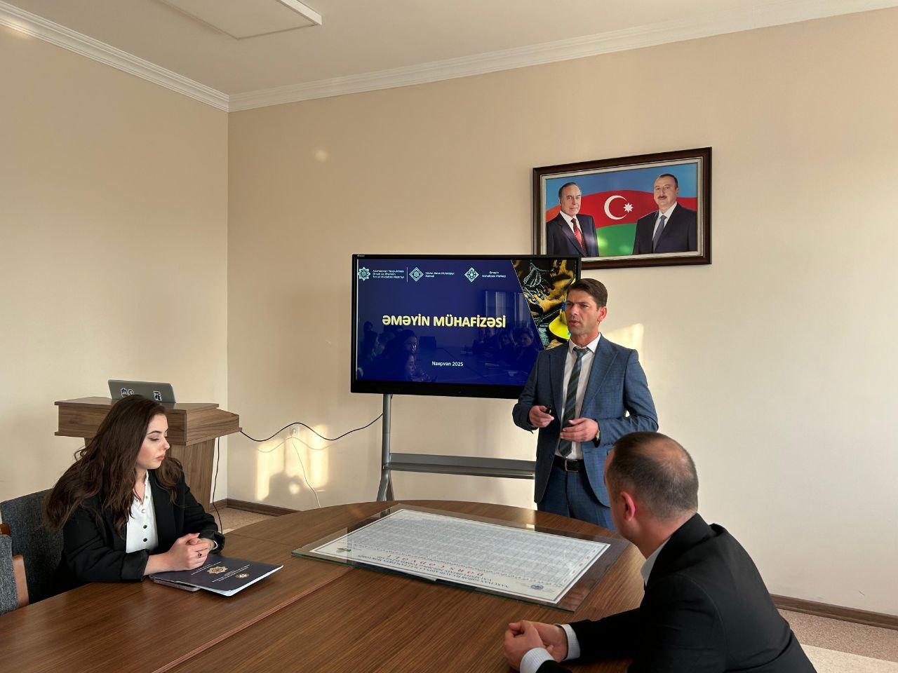 Təlim Naxçıvan şəhər H.Cavid adına 5 nömrəli tam orta məktəbdə təşkil olunub və “İş yerlərində əməyin mühafizəsi, texniki təhlükəsizlik, iş yerlərinin attestasiyası və işçilərin bədbəxt hadisələrdən icbari sığortası” mövzusuna həsr edilib.