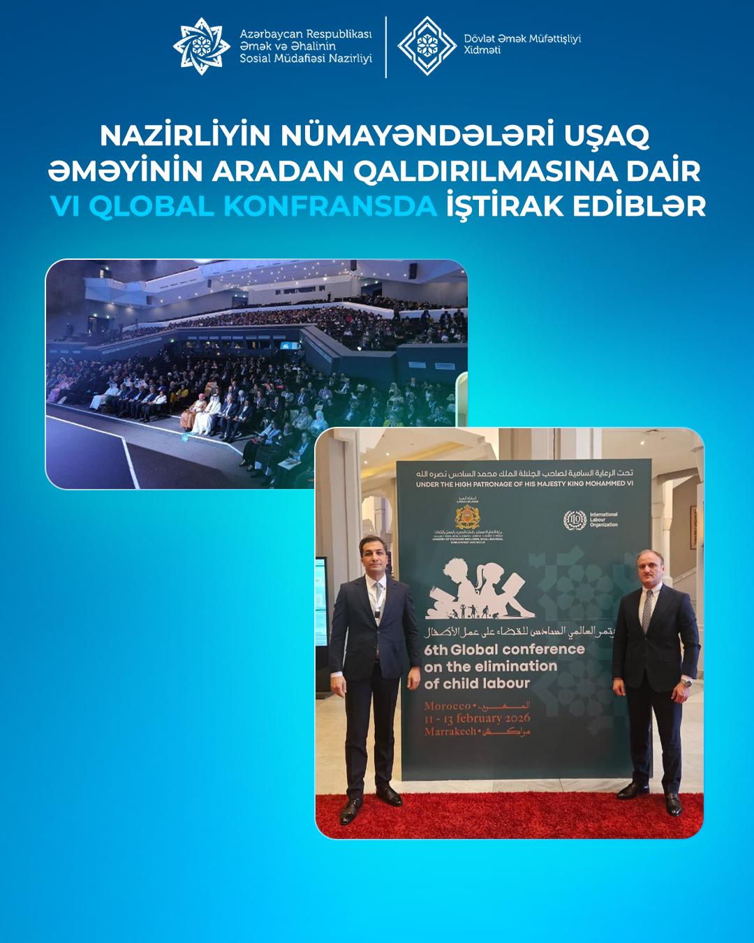 Əmək və Əhalinin Sosial Müdafiəsi Nazirliyinin Əmək siyasəti şöbəsinin müdiri Fuad Heydərov və Nazirlik yanında Dövlət Əmək Müfəttişliyi Xidmətinin rəis müavini Azər Rəhimov uşaq əməyinin aradan qaldırılmasına dair VI Qlobal Konfransda (Mərakeş) iştirak ediblər.