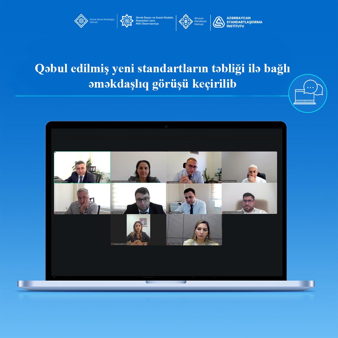 Əmək və Əhalinin Sosial Müdafiəsi Nazirliyi yanında Dövlət Əmək Müfəttişliyi Xidməti, Azərbaycan Standartlaşdırma İnstitutu, Əmək Bazarı və Sosial Müdafiə Məsələləri üzrə Milli Observatoriya və Əməyin Mühafizəsi Mərkəzi arasında əməkdaşlığa dair onlayn görüş təşkil olunub.