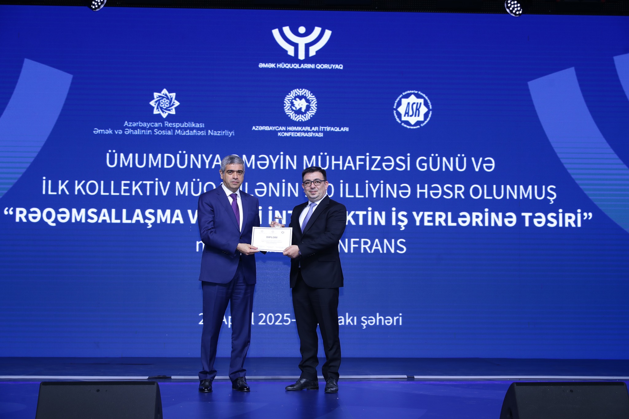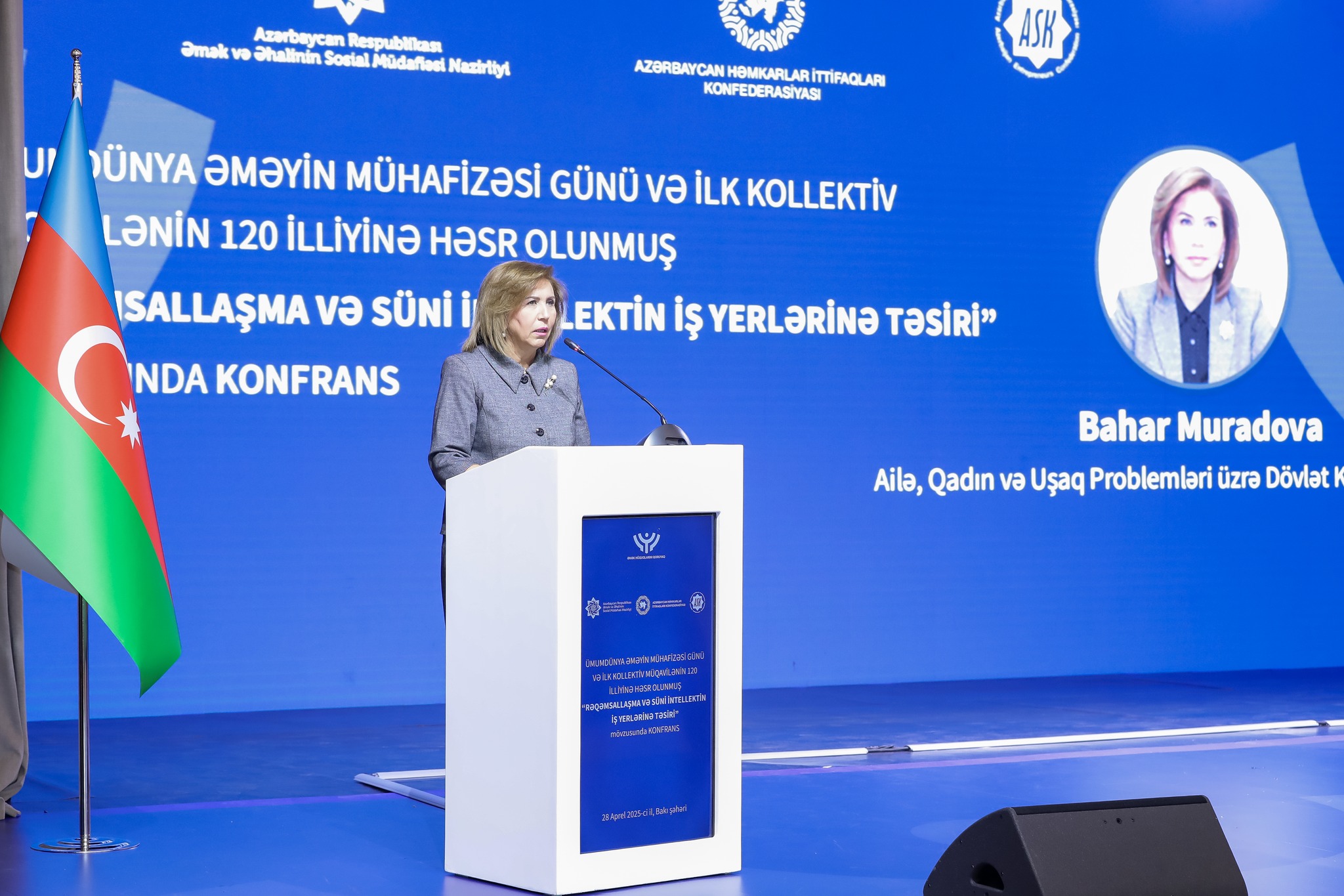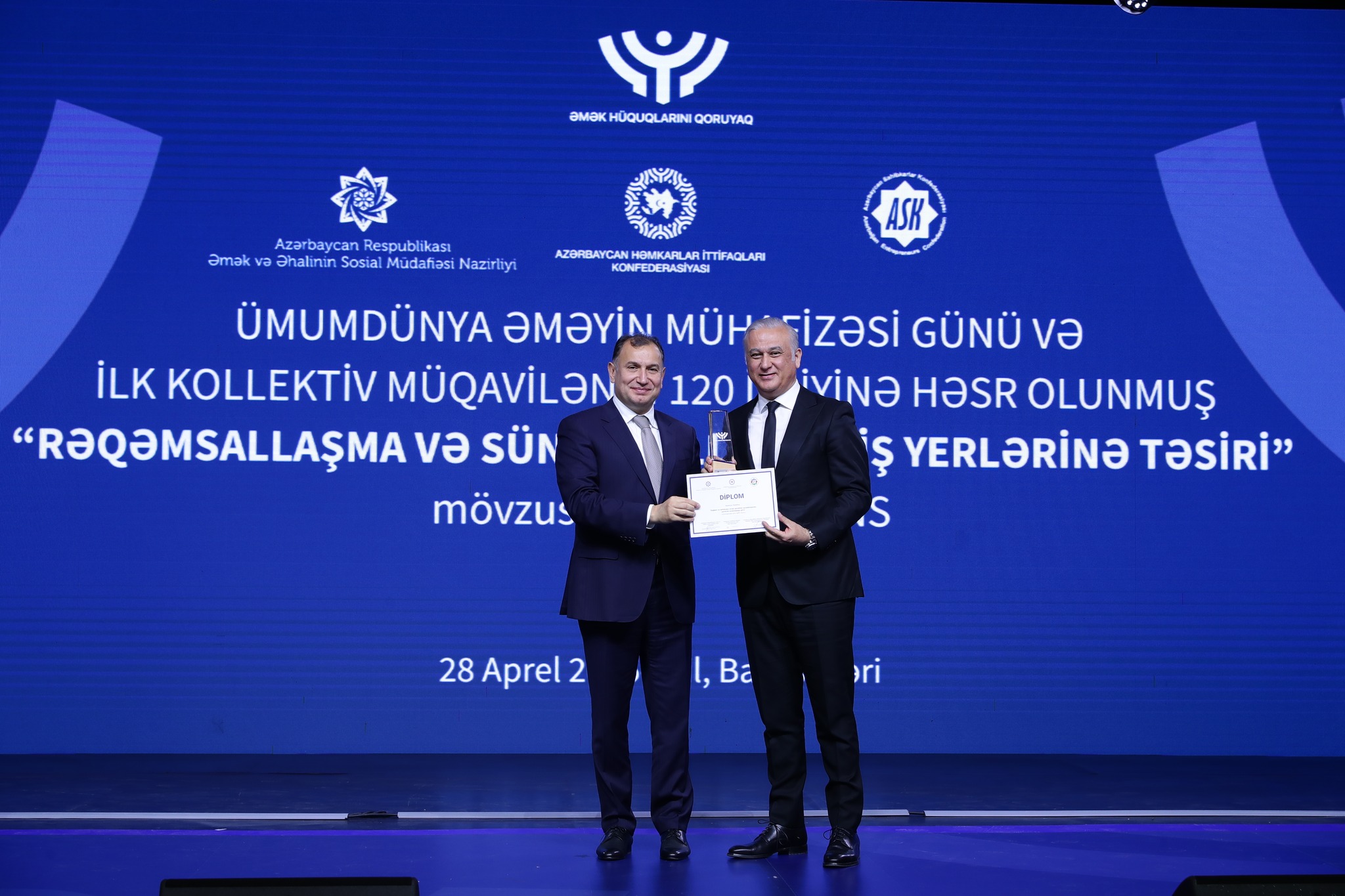 Əmək və Əhalinin Sosial Müdafiəsi Nazirliyi, Azərbaycan Həmkarlar İttifaqları Konfederasiyası (AHİK) və Azərbaycan Respublikası Sahibkarlar (İşəgötürənlər) Təşkilatları Milli Konfederasiyasının (ASK) birgə təşkilatçılığı ilə 28 Aprel – Ümumdünya Əməyin Mühafizəsi Günü və ilk kollektiv müqavilənin 120 illiyinə həsr olunmuş “Rəqəmsallaşma və süni intellektin iş yerlərinə təsiri” mövzusunda konfrans keçirilib. Tədbirdə dövlət və özəl qurumların, beynəlxalq təşkilatların nümayəndələri, həmçinin həmkarlar ittifaqlarının üzvləri iştirak ediblər.