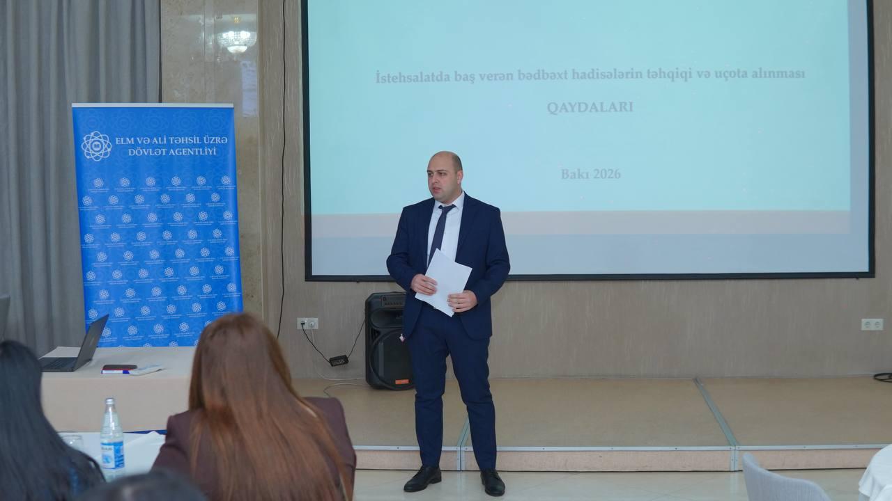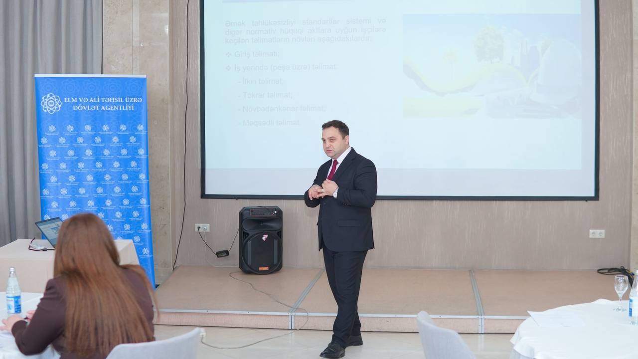 Elm və Ali Təhsil üzrə Dövlət Agentliyinin təşkilatçılığı ilə keçirilən təlimdə 16 orta ixtisas təhsili müəssisəsinin rəhbəri iştirak edib. Təlim zamanı əməyin mühafizəsi üzrə təhlükəsizlik qaydalarına riayət olunmasının əhəmiyyəti, istehsalatda baş verə biləcək bədbəxt hadisələrin və peşə xəstəliklərinin qarşısının alınması istiqamətində görülən tədbirlər barədə iştirakçılara ətraflı məlumat verilib.