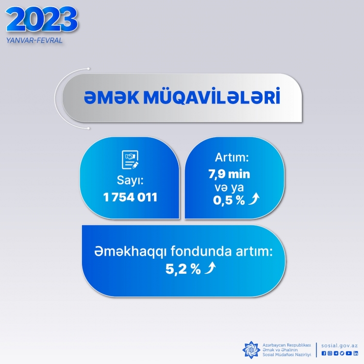 Bu ilin yanvar-fevral aylarında ölkəmizdə əmək müqavilələrinin sayı 7,9 min və ya 0,5 faiz artaraq 1 mart 2023-cü il tarixinə 1 754 011 müqavilə təşkil edib.