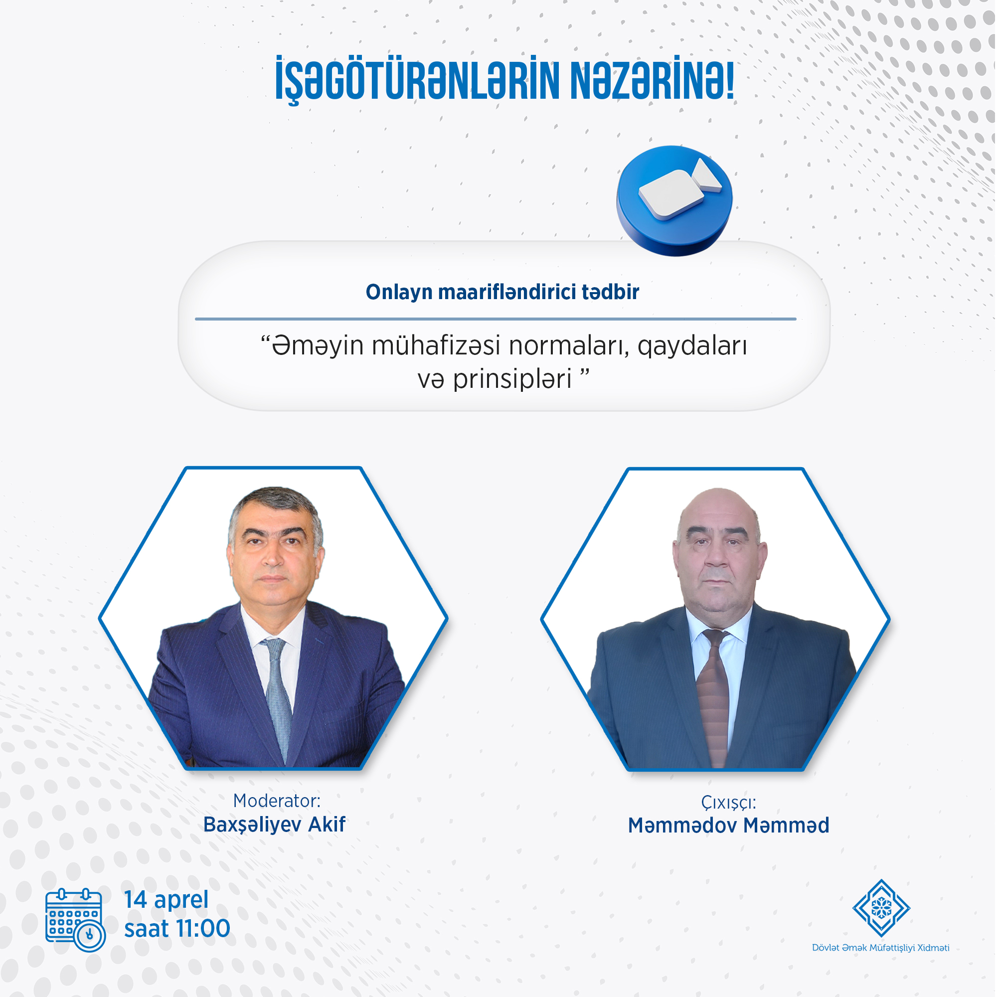14 aprel 2023-cü il tarixində saat 11:00-da Dövlət Əmək Müfəttişliyi Xidməti "Əməyin mühafizəsi normaları, qaydaları və prinsipləri" mövzusunda növbəti onlayn maarifləndirmə tədbirini keçirəcək.
