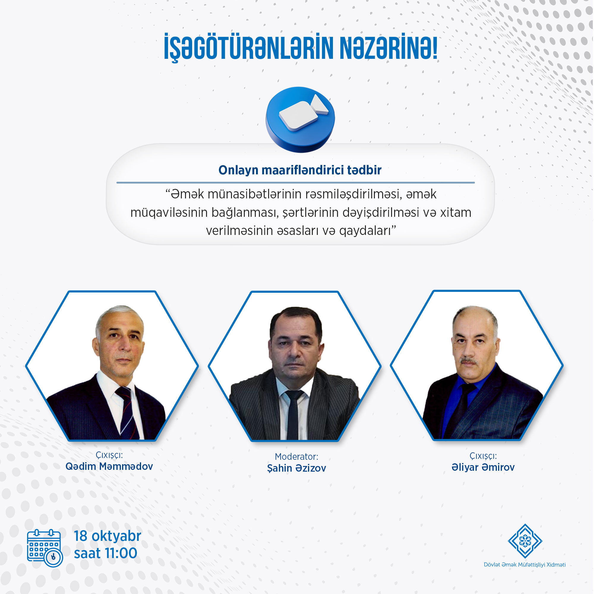 18 noyabr 2022-ci il tarixində saat 11:00-da Dövlət Əmək Müfəttişliyi Xidməti "Əmək münasibətlərinin rəsmiləşdirilməsi, əmək müqaviləsinin bağlanması, şərtlərinin dəyişdirilməsi və xitam verilməsinin əsasları və qaydaları" mövzusunda növbəti onlayn maarifləndirmə tədbirini keçirəcək.