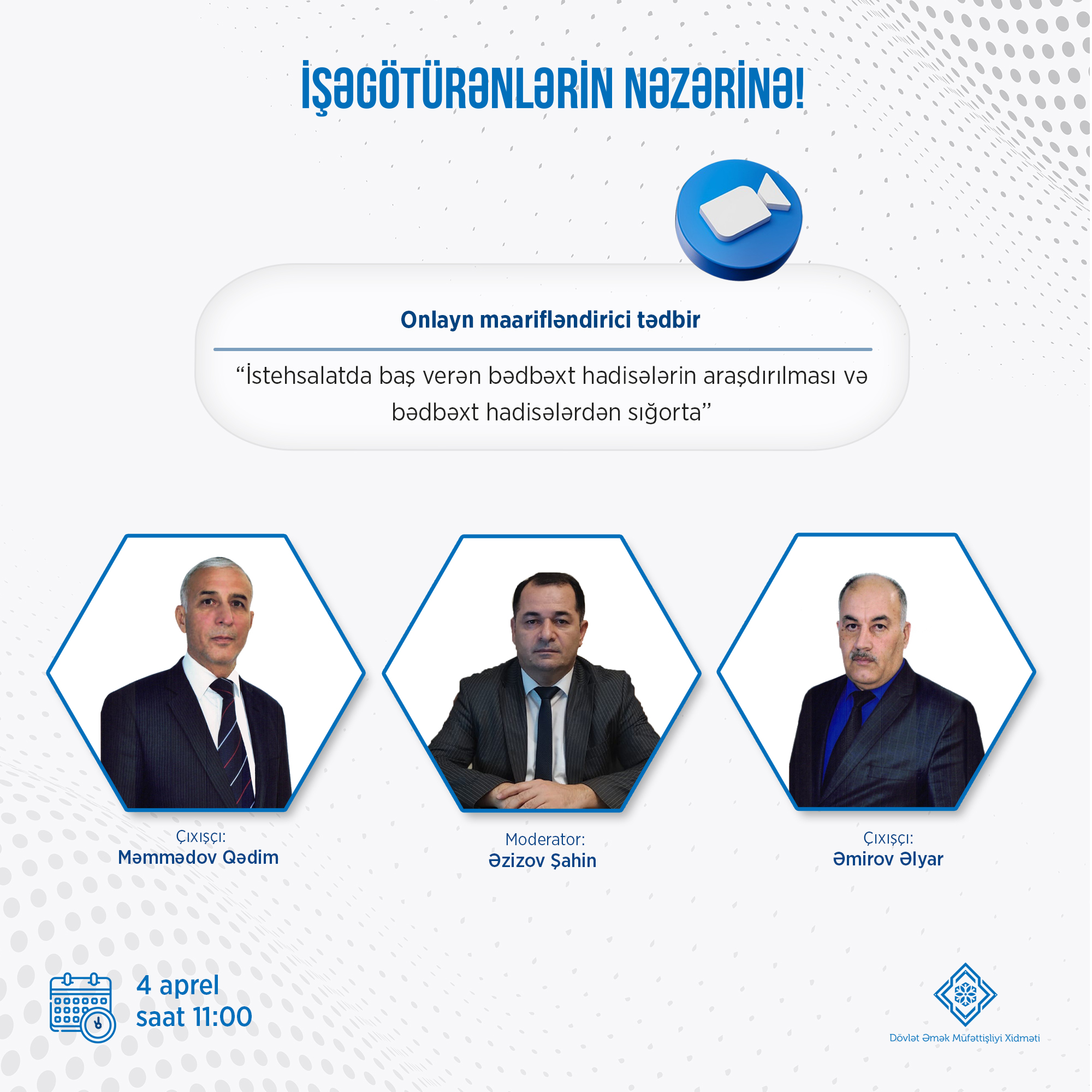 4 aprel 2023-cü il tarixində saat 11:00-da Dövlət Əmək Müfəttişliyi Xidməti "İstehsalatda baş verən bədbəxt hadisələrin araşdırılması və bədbəxt hadisələrdən sığorta" mövzusunda növbəti onlayn maarifləndirmə tədbirini keçirəcək.