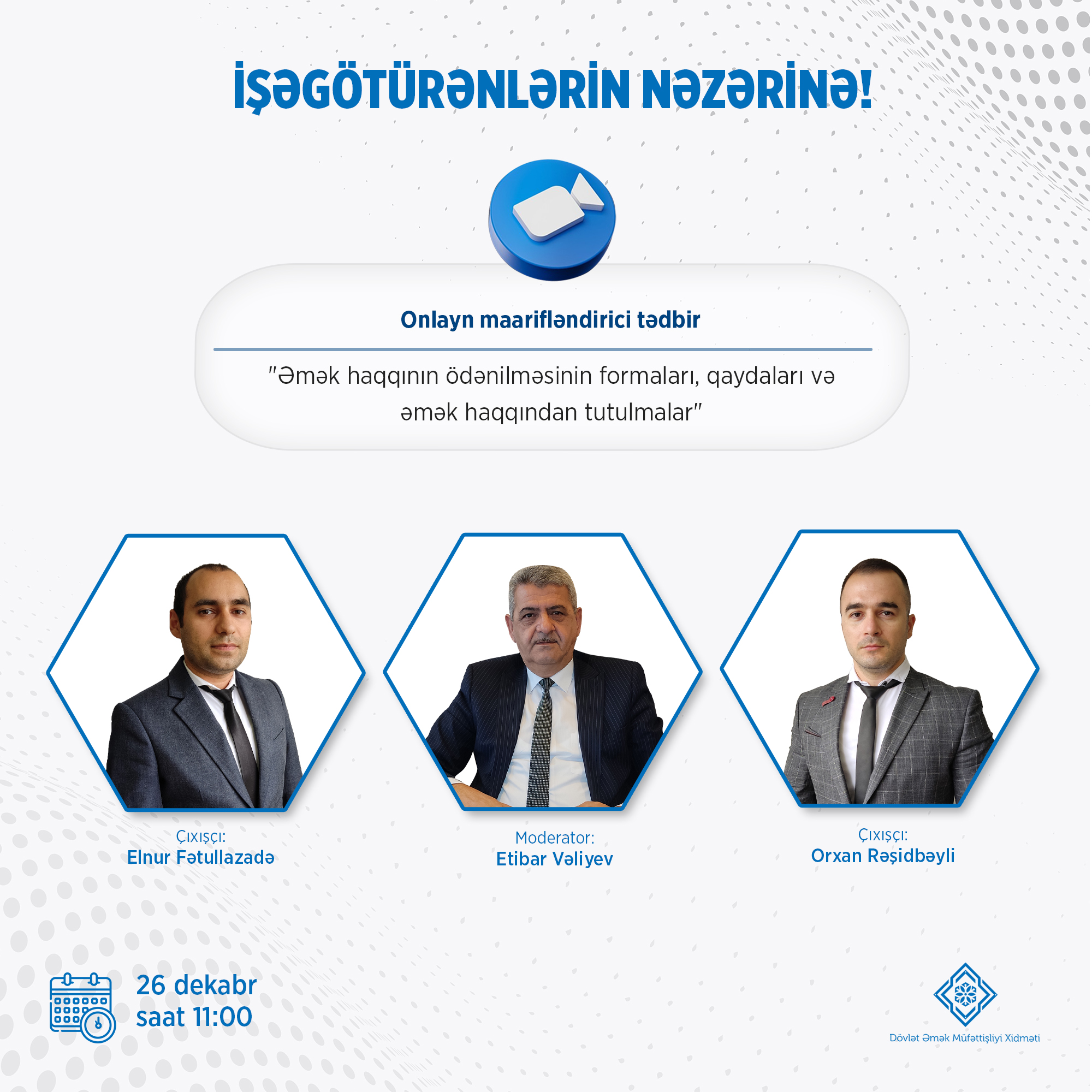 Dekabr ayının 26-ı saat 11:00-da Dövlət Əmək Müfəttişliyi Xidməti "Əmək haqqının ödənilməsinin formaları, qaydaları və əmək haqqından tutulmalar" mövzusunda növbəti onlayn maarifləndirmə tədbirini keçirəcək.