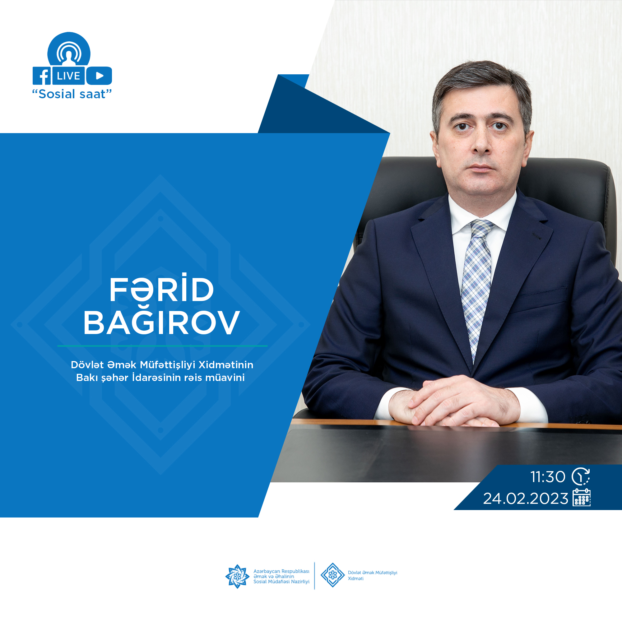 “Sosial saat”ın bu dəfəki qonağı Dövlət Əmək Müfəttişliyi Xidmətinin Bakı şəhər İdarəsinin rəis müavini Fərid Bağırovdur.