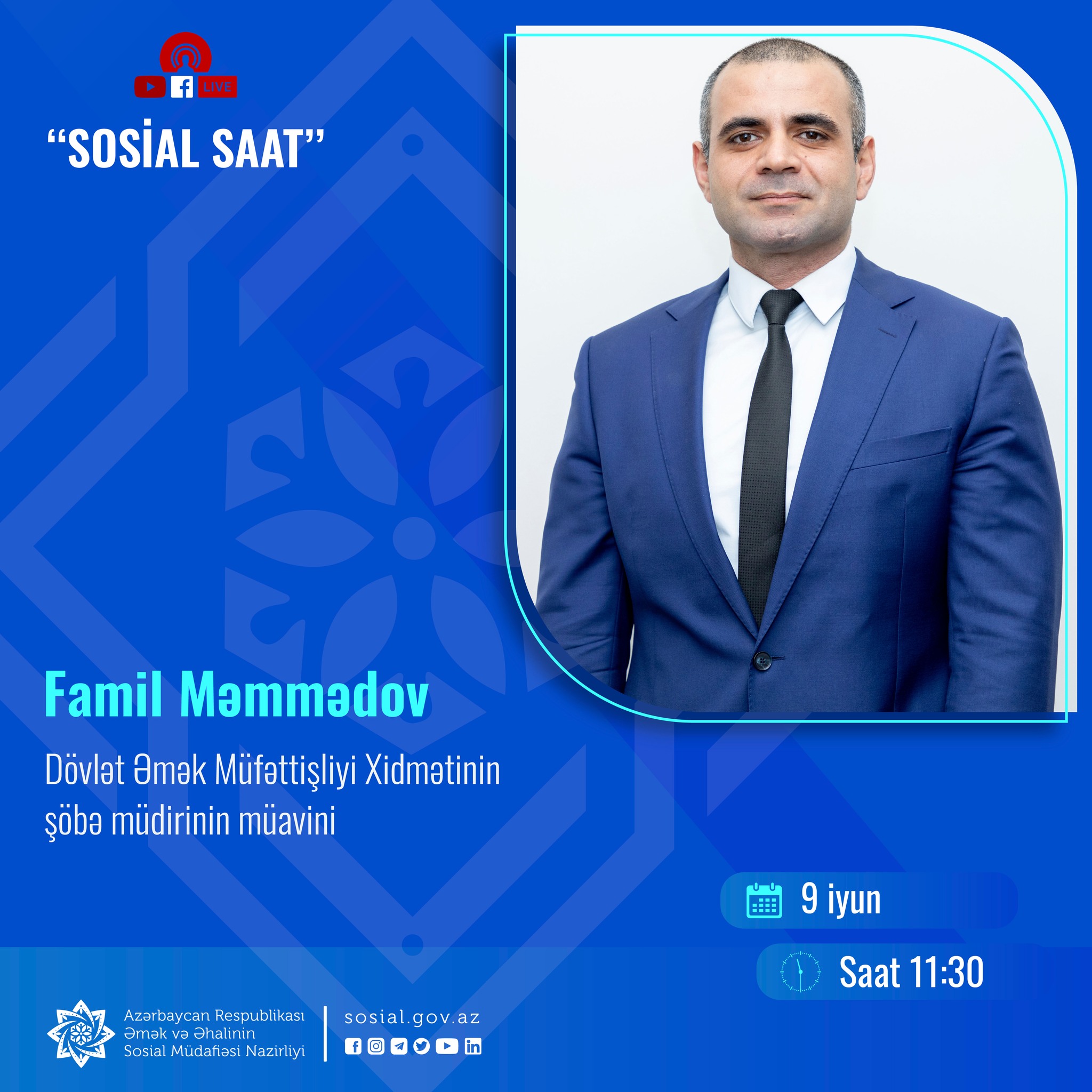 “Sosial saat”ın bu dəfəki qonağı Dövlət Əmək Müfəttişliyi Xidmətinin şöbə müdirinin müavini Famil Məmmədovdur. Məzuniyyət hüququ və onun təmin edilməsi ilə bağlı suallar canlı yayımda cavablandırılacaq.