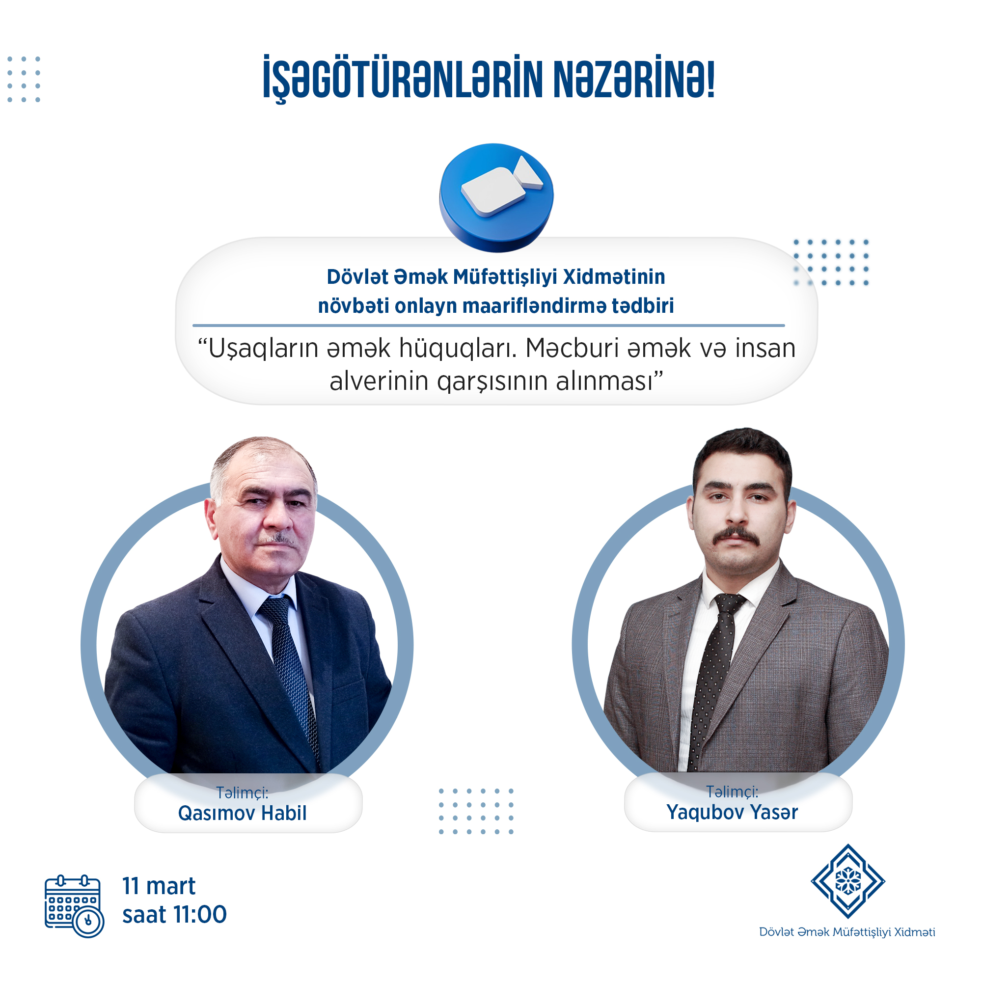 11 mart 2022-ci il tarixində saat 11:00-da Dövlət Əmək Müfəttişliyi Xidməti "Uşaqların əmək hüquqları. Məcburi əmək və insan alverinin qarşısının alınması" mövzusunda növbəti onlayn maarifləndirmə tədbirini keçirəcək.