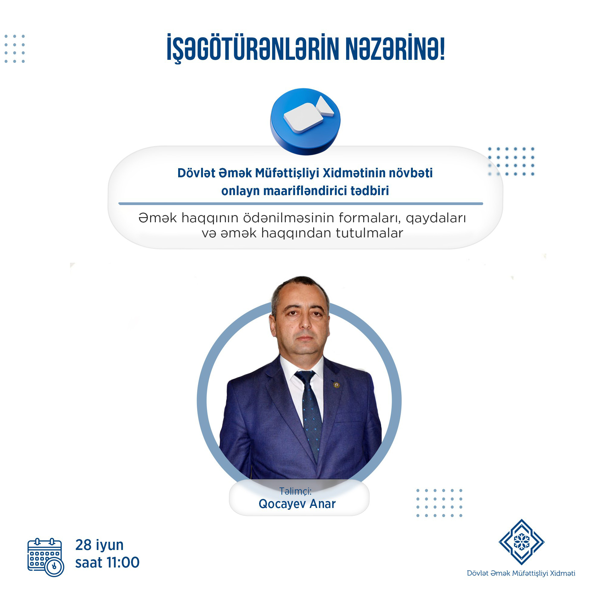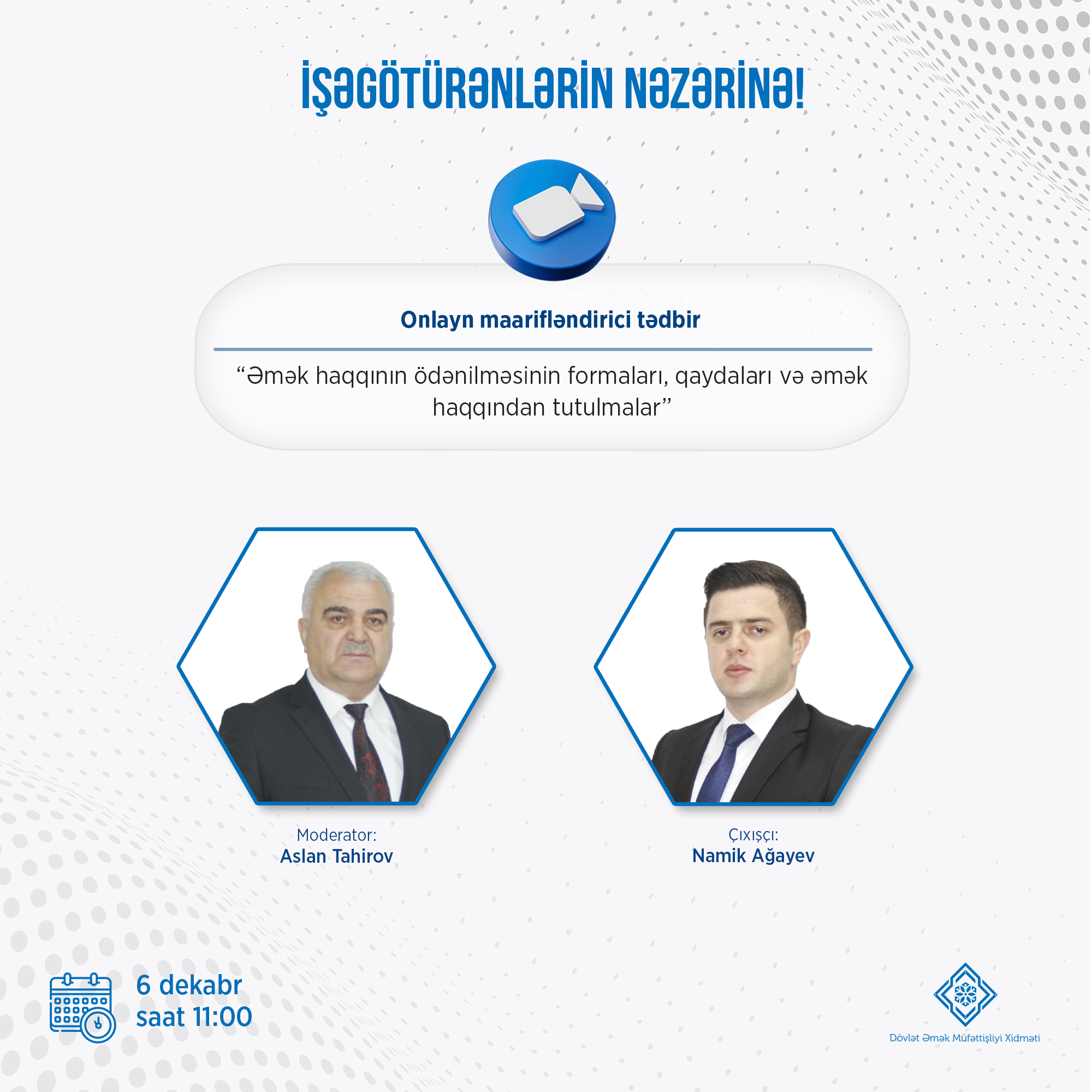 Dekabr ayının 26-ı saat 11:00-da Dövlət Əmək Müfəttişliyi Xidməti "Əmək haqqının ödənilməsinin formaları, qaydaları və əmək haqqından tutulmalar" mövzusunda növbəti onlayn maarifləndirmə tədbirini keçirəcək