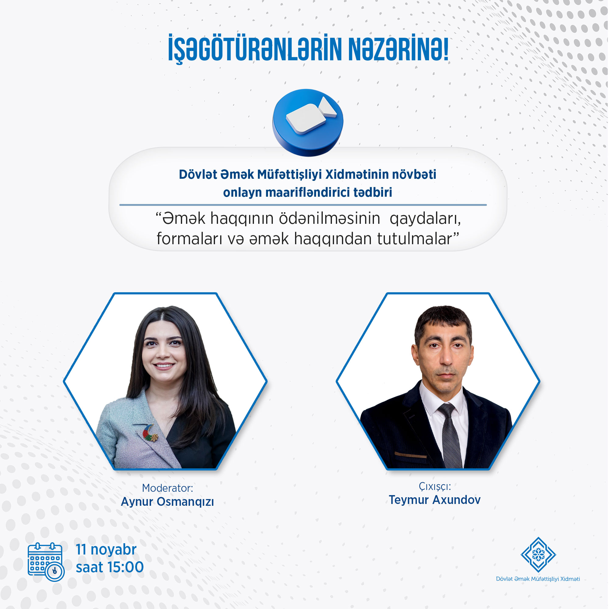 11 noyabr 2022-ci il tarixində saat 15:00-da Dövlət Əmək Müfəttişliyi Xidməti "Əmək haqqının ödənilməsinin formaları, qaydaları və əmək haqqından tutulmalar" mövzusunda növbəti onlayn maarifləndirmə tədbirini keçirəcək