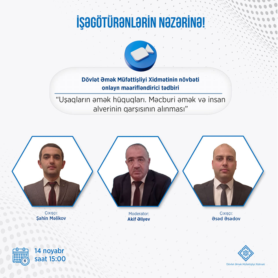 14 noyabr 2022-ci il tarixində saat 15:00-da Dövlət Əmək Müfəttişliyi Xidməti "Uşaqların əmək hüquqları. Məcburi əmək və insan alverinin qarşısının alınması" mövzusunda növbəti onlayn maarifləndirmə tədbirini keçirəcək