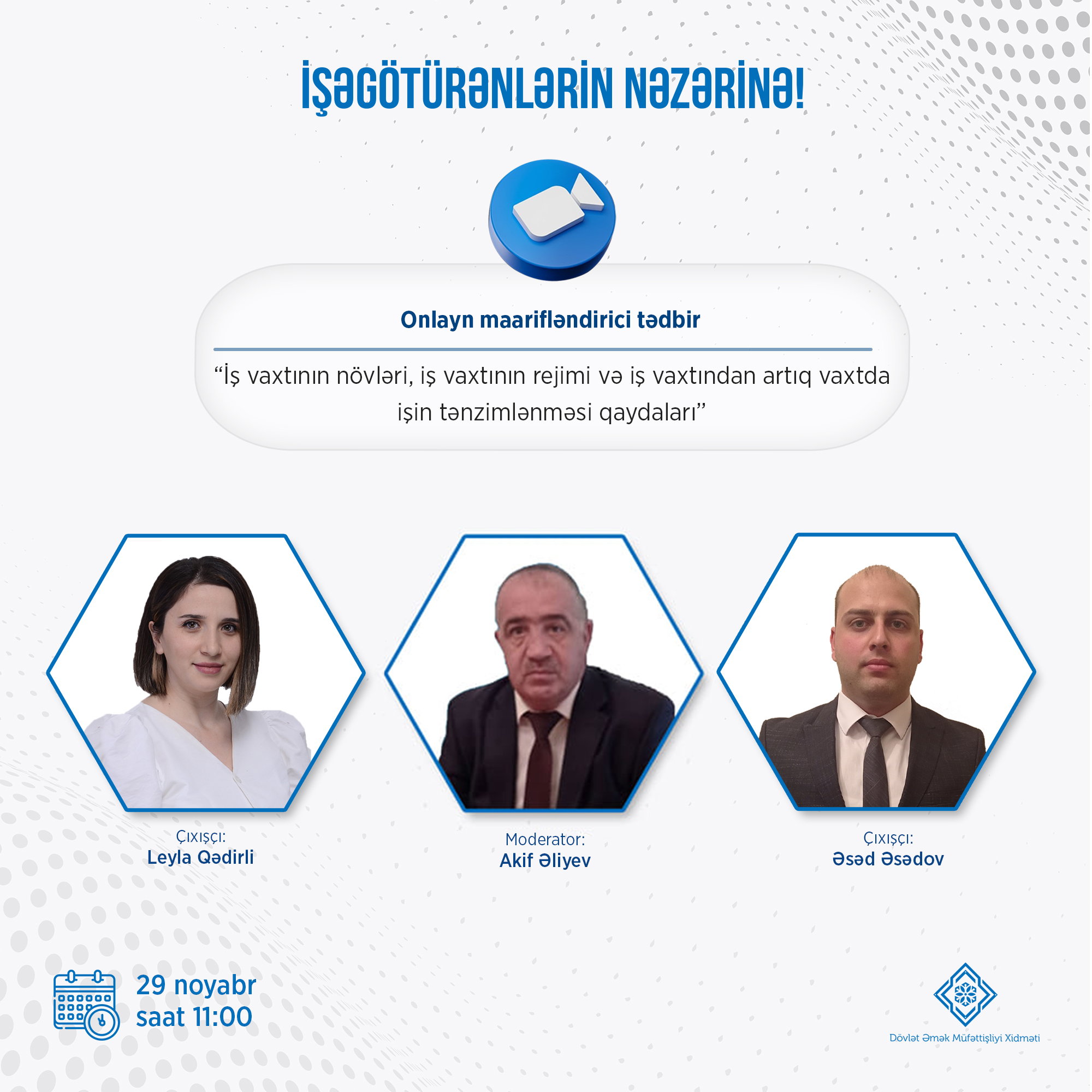 29 noyabr 2022-ci il tarixində saat 11:00-da Dövlət Əmək Müfəttişliyi Xidməti "İş vaxtının növləri, iş vaxtının rejimi və iş vaxtından artıq vaxtda işin tənzimlənməsi qaydaları" mövzusunda növbəti onlayn maarifləndirmə tədbirini keçirəcək