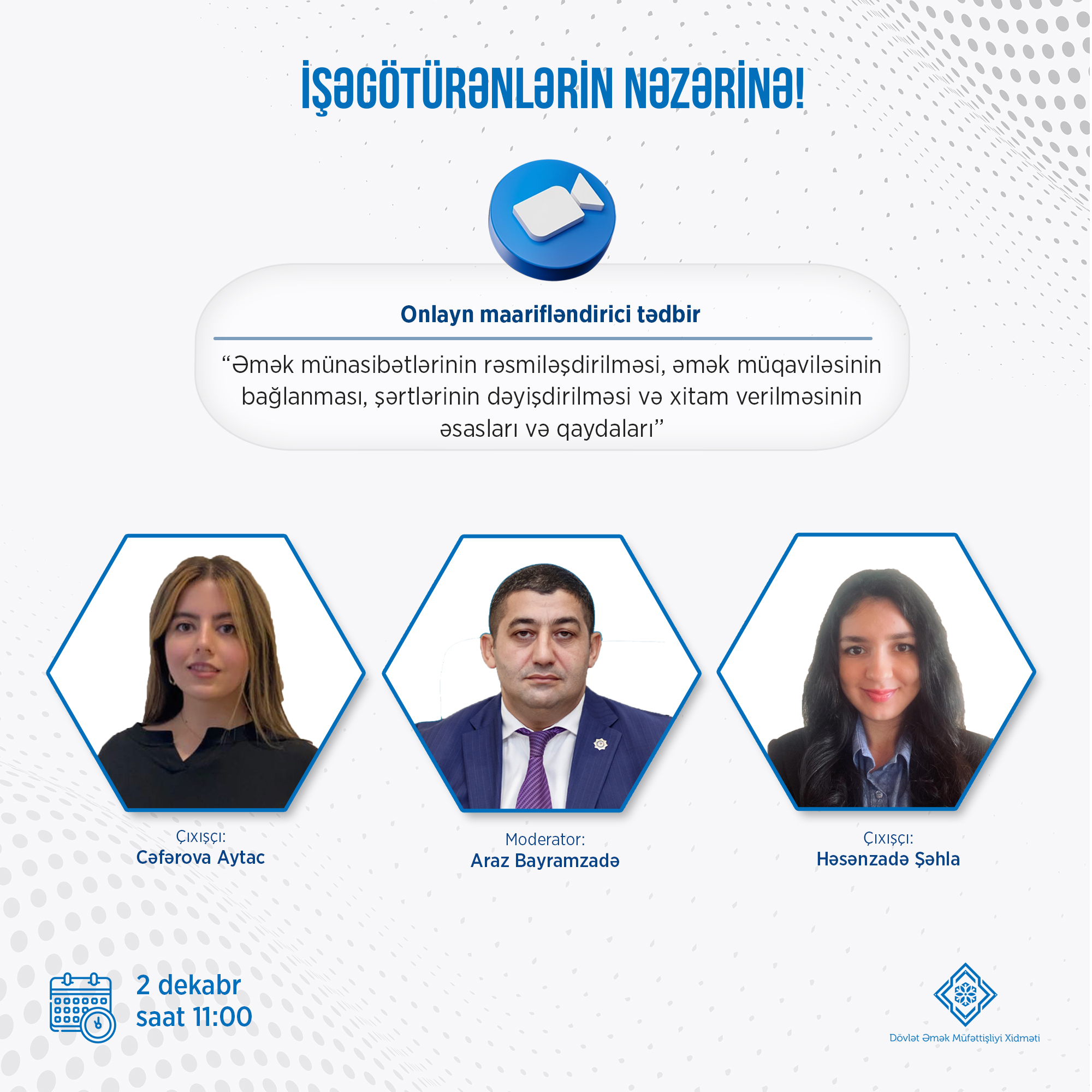 2 dekabr 2022-ci il tarixində saat 11:00-da "Əmək münasibətlərinin rəsmiləşdirilməsi, əmək müqaviləsinin bağlanması, şərtlərinin dəyişdirilməsi və xitam verilməsinin əsasları və qaydaları" mövzusunda növbəti onlayn maarifləndirmə tədbiri keçiriləcək