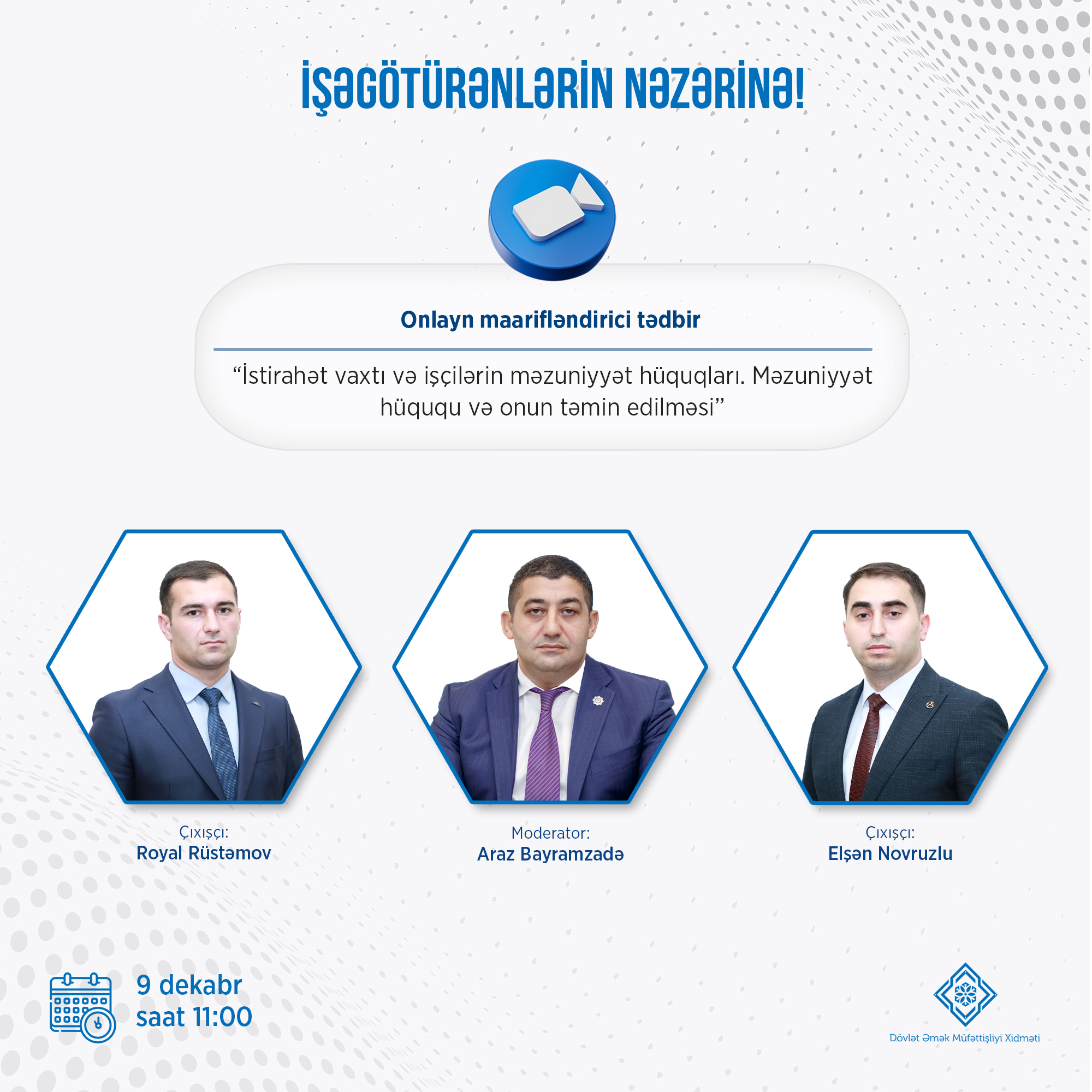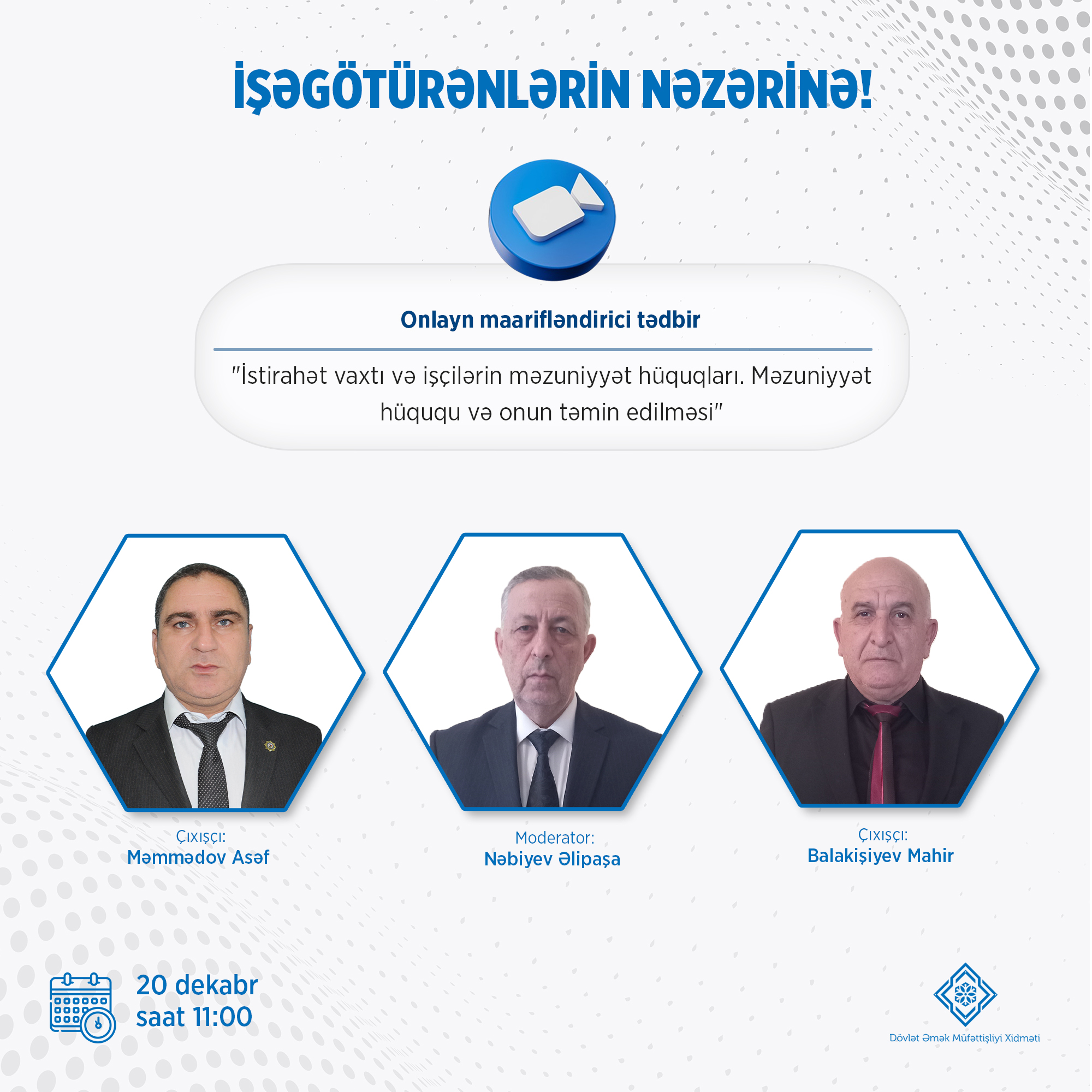 Dekabr ayının 20-si saat 11:00-da Dövlət Əmək Müfəttişliyi Xidməti "İstirahət vaxtı və işçilərin məzuniyyət hüquqları. Məzuniyyət hüququ və onun təmin edilməsi" mövzusunda növbəti onlayn maarifləndirmə tədbirini keçirəcək