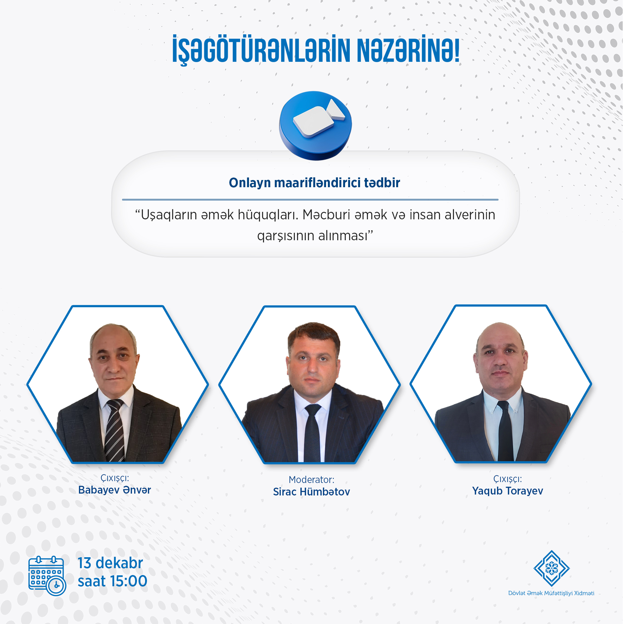 13 dekabr 2022-ci il tarixində saat 15:00-da Dövlət Əmək Müfəttişliyi Xidməti "Uşaqların əmək hüquqları. Məcburi əmək və insan alverinin qarşısının alınması" mövzusunda növbəti onlayn maarifləndirmə tədbirini keçirəcək