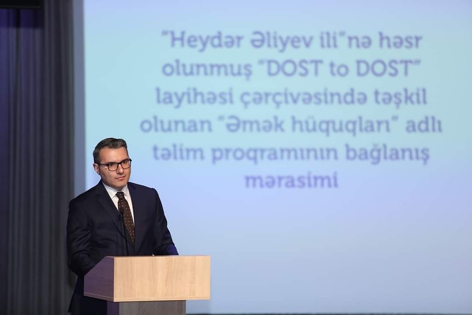 Dövlət Əmək Müfəttişliyi Xidməti və Nazirliyin tabeliyindəki DOST Agentliyinin birgə layihəsi (“DOST to DOST”) çərçivəsində “Heydər Əliyev İli”nə həsr olunmuş “Əmək hüquqları” adlı təlim proqramının yekun tədbiri keçirilib
