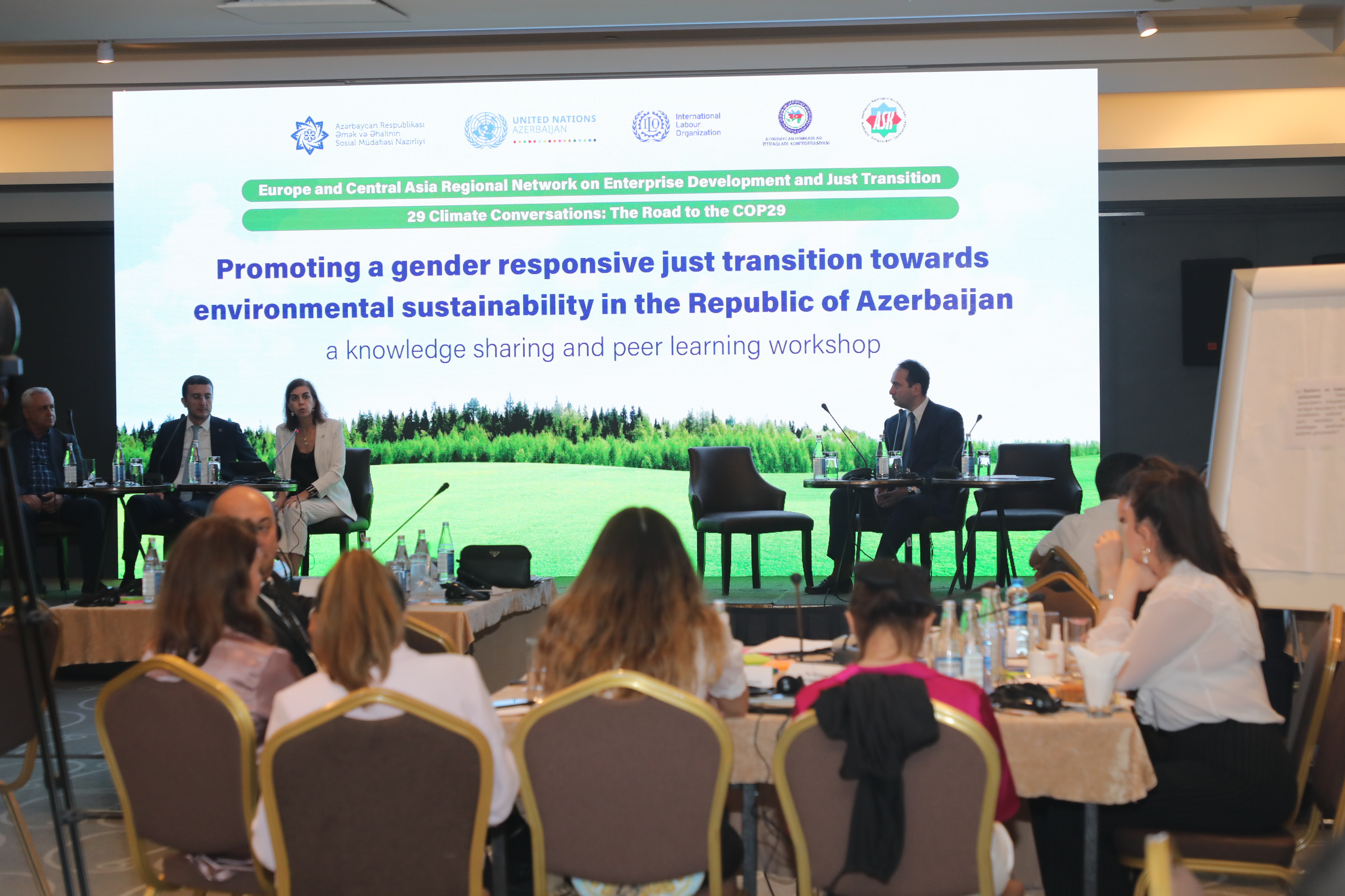 Əmək və Əhalinin Sosial Müdafiəsi Nazirliyi və Beynəlxalq Əmək Təşkilatının (BƏT) birgə təşkilatçılığı ilə “29 İqlim Söhbəti: COP29-a gedən yol” silsiləsi çərçivəsində "Azərbaycan Respublikasında ətraf mühitin dayanıqlığına doğru genderə həssas ədalətli keçidin təşviqi” mövzusunda keçirilən seminar davam edib.