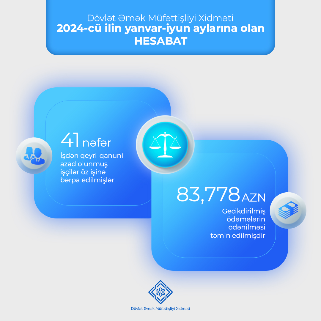 2024-cü ilin I yarımili ərzində Əmək və Əhalinin Sosial Müdafiəsi Nazirliyi yanında Dövlət Əmək Müfəttişliyi Xidməti tərəfindən 8342 şikayət xarakterli ərizə araşdırılıb, 8882 məktub və sorğu cavablandırılıb. Eyni zamanda Xidmətin rəhbər və vəzifəli şəxsləri tərəfindən 4541 vətəndaş qəbul edilib.