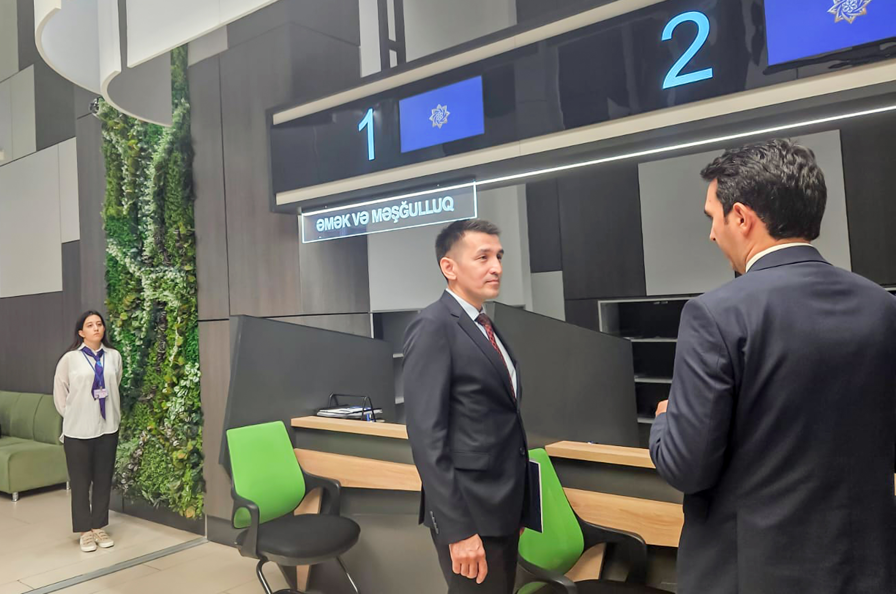 Qazaxıstanlı qonaq daha sonra Əmək və Əhalinin Sosial Müdafiəsi Nazirliyinin göstərilən xidmətlər üzrə vahid pənəcərə sistemi olan DOST konsepsiyası ilə tanış olmaq məqsədilə 5 sayılı DOST Mərkəzində olub. Mərkəzin ümumi iş prinsipi barədə məlumatlandırılan A.İbrahimov “Əmək və Məşğulluq” pəncərəsində vətəndaşlara göstərilən xidməti izləyib.