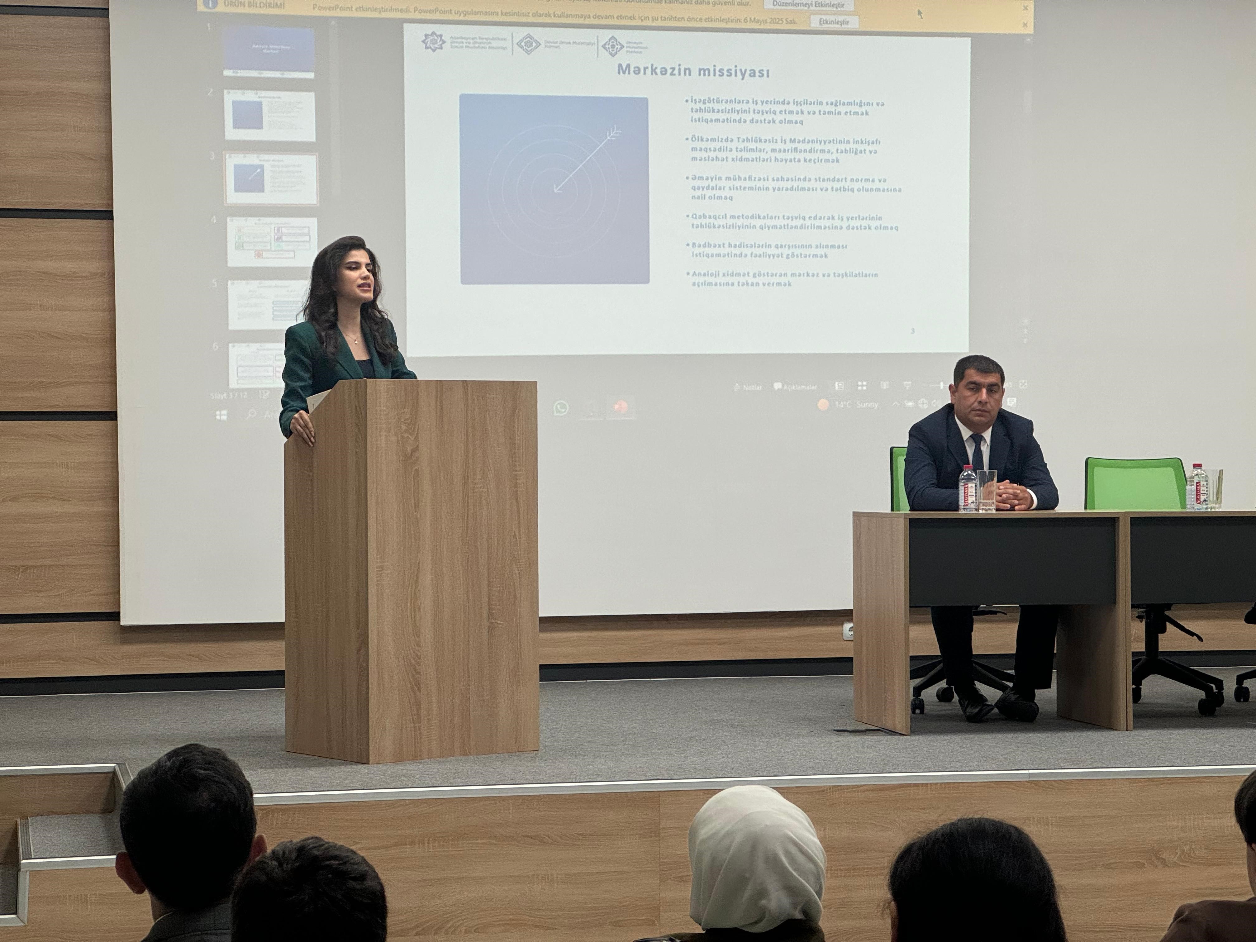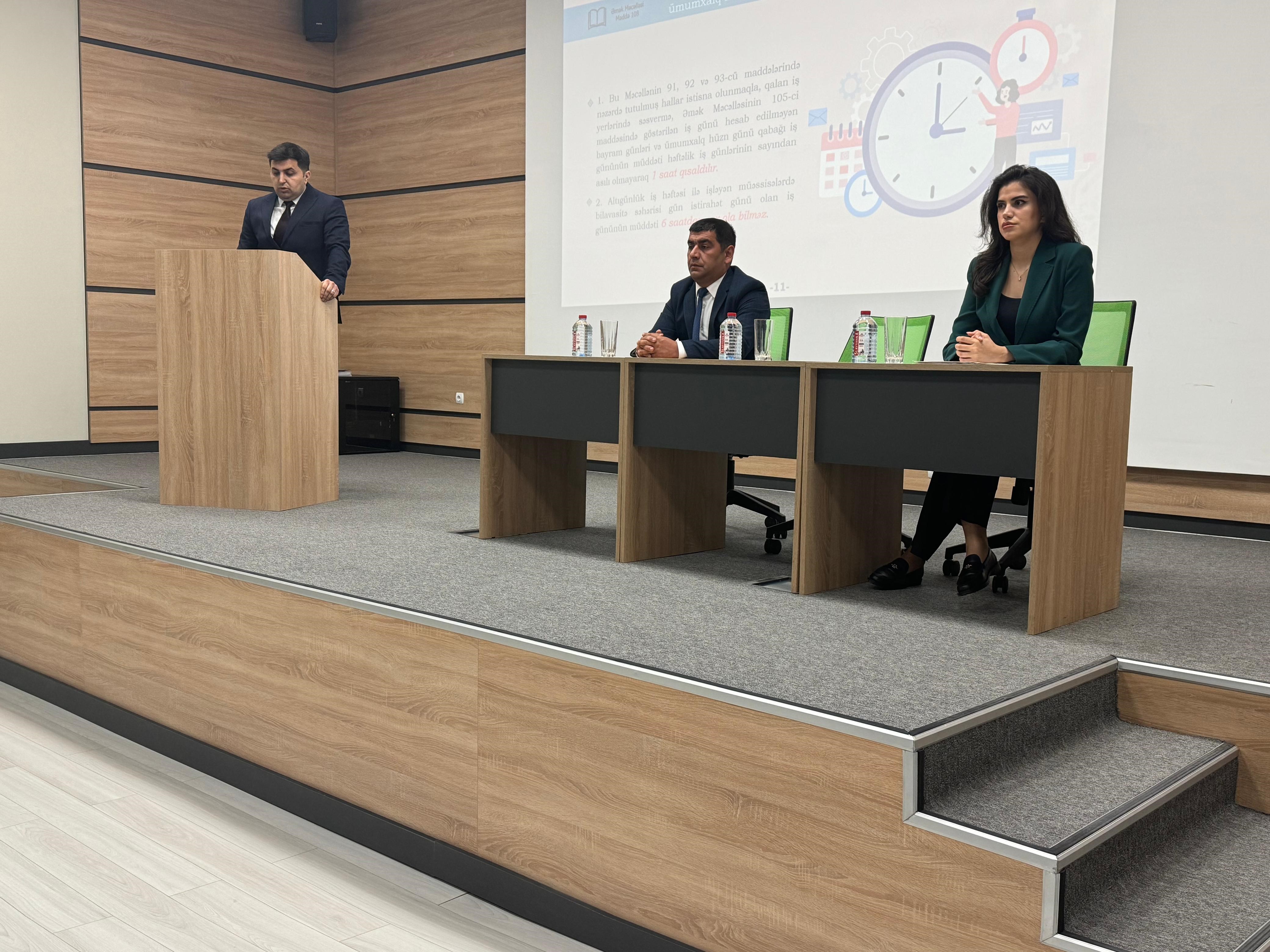 Eyni zamanda, tədbirdə müzakirə olunan mövzuların aktuallığını tədbir iştirakçılarının diqqətinə çatdırıb. Daha sonra regional şöbənin əməkdaşı Səfərli Elvin “İstirahət vaxtı, məzuniyyət hüququ və onların təmin edilməsi”, Əməyin Mühafizəsi Mərkəzinin əməkdaşı Mədinə Mirili isə “Əməyin Mühafizəsi Mərkəzi haqqında” və “İş yerlərində əməyin mühafizəsi” mövzularında təqdimatla çıxış ediblər. İştirakçılara əmək qanunvericiliyində nəzərdə tutulmuş istirahət vaxtı və istirahət günləri, işçilərin məzuniyyət hüquqları, məzuniyyətin növləri barədə, eyni zamanda Mərkəzin fəaliyyəti, əmək hüquqları və əməyin mühafizəsi sahəsində göstərilən məsləhət xidmətləri barədə məlumat verib. Müəssisələrdə əməyin mühafizəsi üzrə standart, norma və qaydaların tətbiqinə göstərilən dəstək və yeni qəbul edilmiş standartlarla bağlı iştirakçılar məlumatlandırılıb.