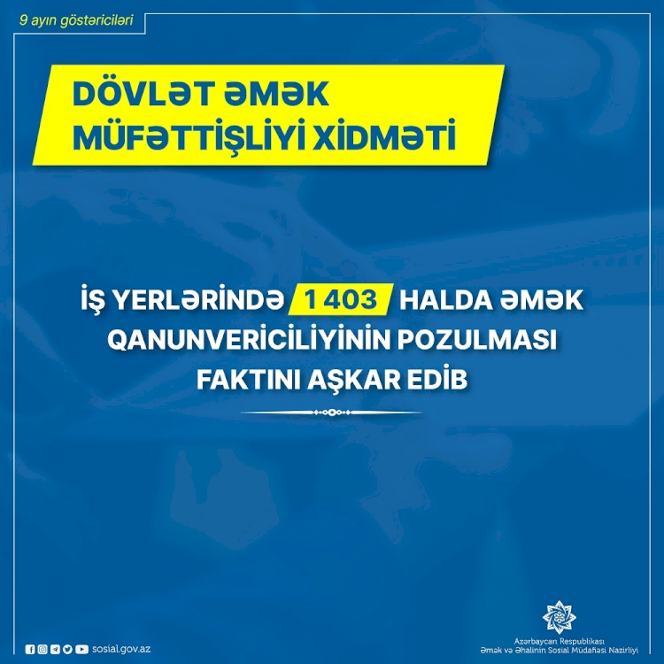 Əmək və Əhalinin Sosial Müdafiəsi Nazirliyi yanında Dövlət Əmək Müfəttişliyi Xidməti bu ilin 9 ayında işəgötürənlər tərəfindən 1403 halda əmək qanunvericiliyinin tələblərinin pozulması faktını aşkar edib.