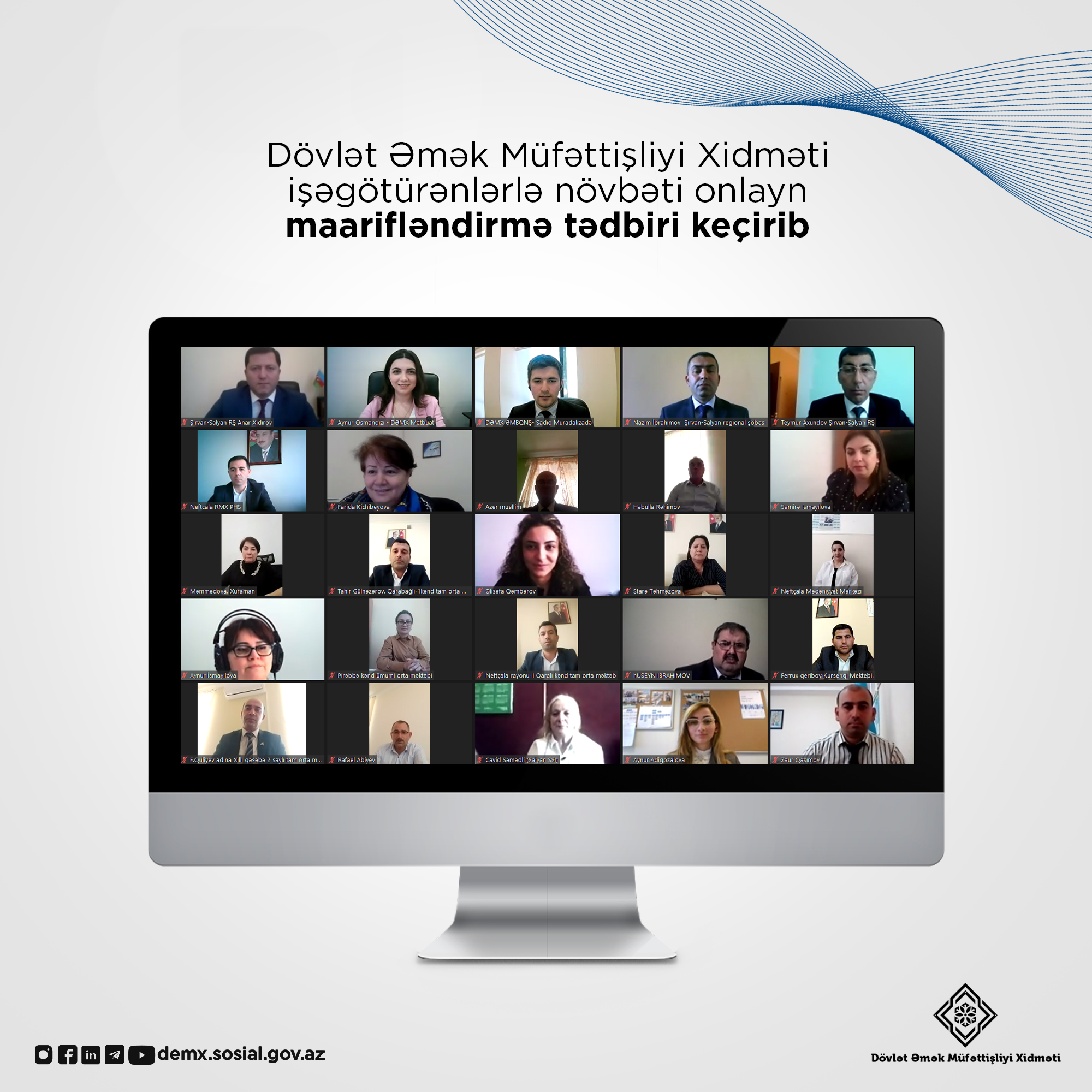 Əmək və Əhalinin Sosial Müdafiəsi Nazirliyi yanında Dövlət Əmək Müfəttişliyi Xidməti işəgötürənlər üçün "Əmək münasibətlərinin rəsmiləşdirilməsi, əmək müqaviləsinin bağlanması, şərtlərinin dəyişdirilməsi və xitam verilməsinin əsasları və qaydaları" mövzusunda növbəti maarifləndirici onlayn tədbir keçirib.