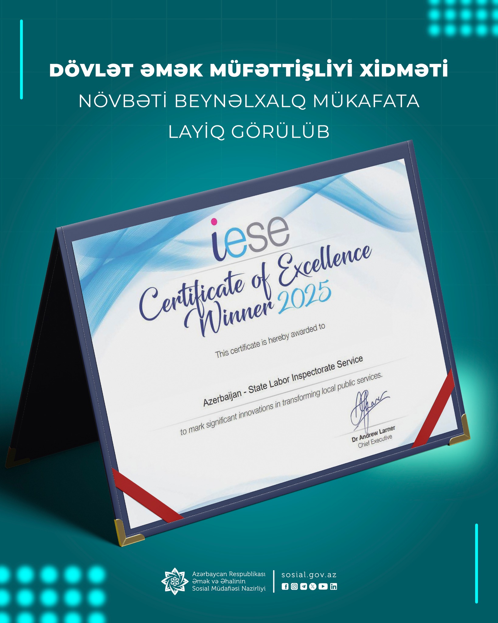 Əmək və Əhalinin Sosial Müdafiəsi Nazirliyi yanında Dövlət Əmək Müfəttişliyi Xidməti (DƏMX) Böyük Britaniyanın “Improvement and Efficiency Social Enterprise (iESE)” müəssisəsi tərəfindən keçirilən nüfuzlu “iESE Awards 2025” müsabiqəsində qalib elan olunub.