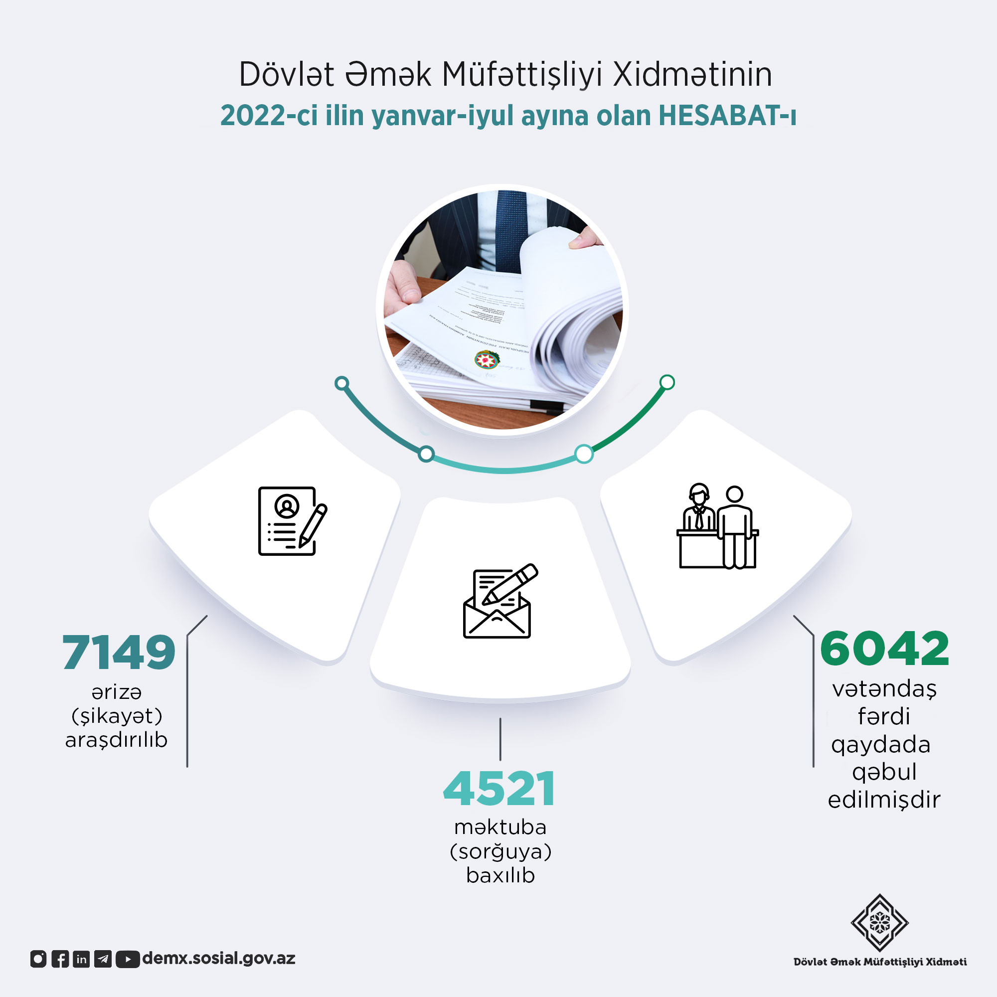 2022-ci ilin yanvar-iyul ayları ərzində Əmək və Əhalinin Sosial Müdafiəsi Nazirliyi yanında Dövlət Əmək Müfəttişliyi Xidməti tərəfindən vətəndaşlardan daxil olmuş 7149 şikayət məzmunlu ərizə, eləcə də müxtəlif müəssisə, idarə və təşkilatlar tərəfindən göndərilmiş 4521 məktub (sorğu) araşdırılaraq cavablandırılıb.