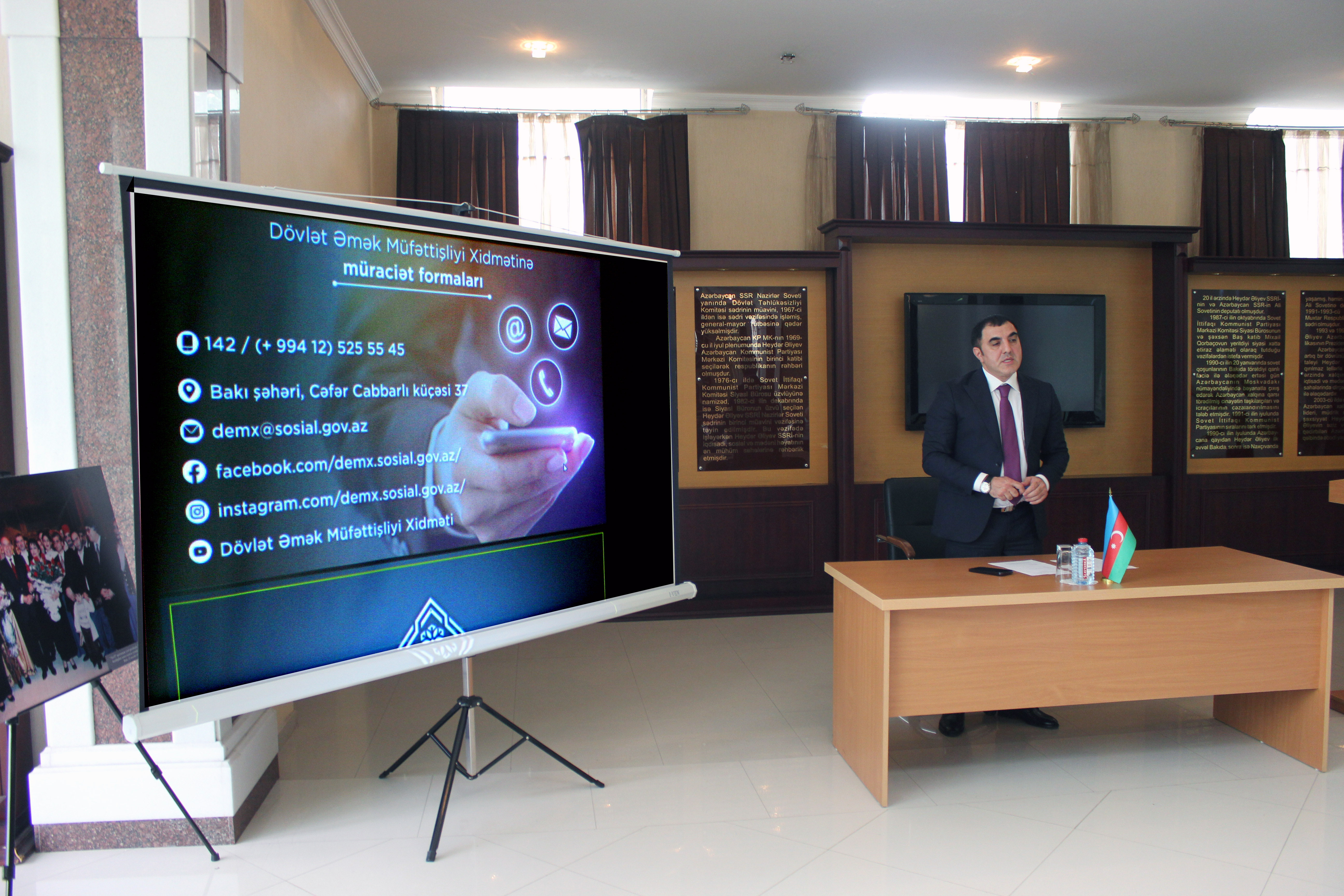 “Heydər Əliyev və Azərbaycanda əmək qanunvericiliyinə əməl olunmasına dövlət nəzarəti sisteminin qurulması” mövzularında videoçarx nümayiş olunub.