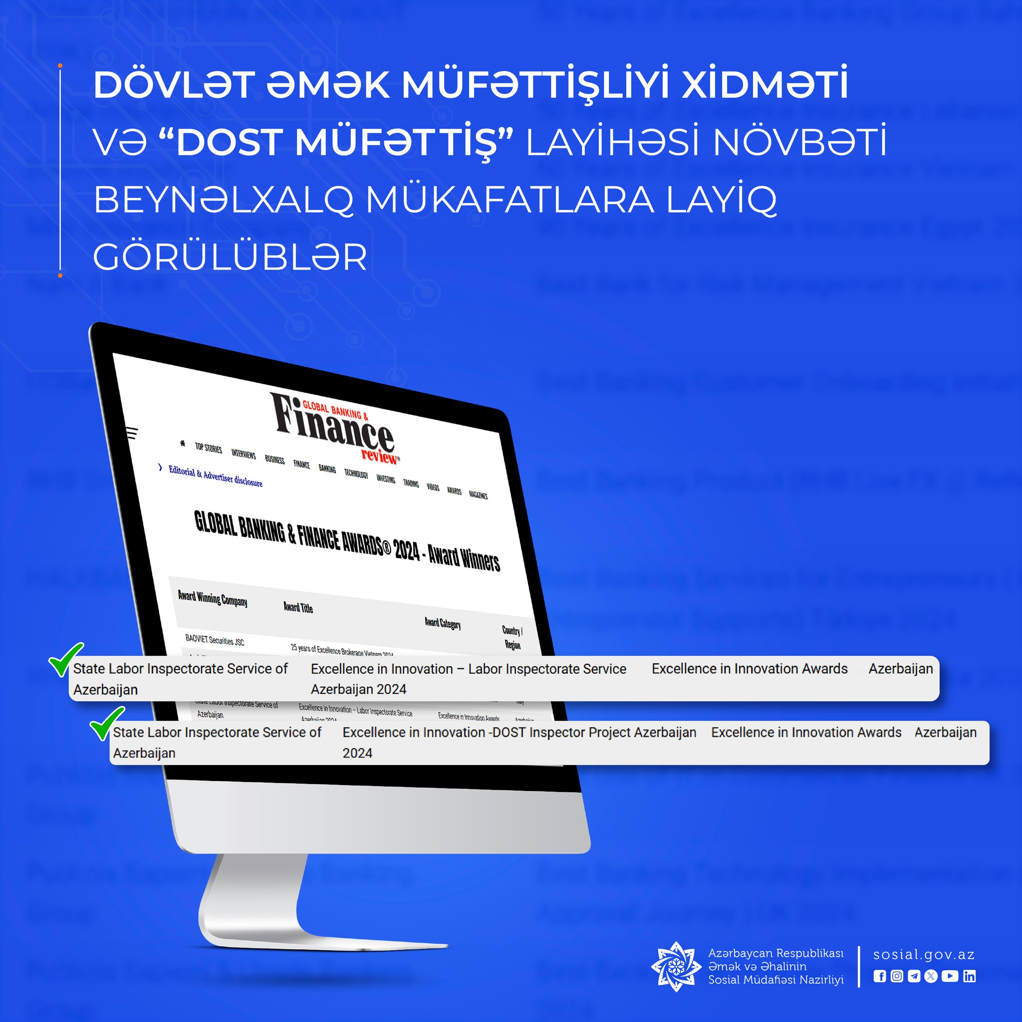 Əmək və Əhalinin Sosial Müdafiəsi Nazirliyi yanında Dövlət Əmək Müfəttişliyi Xidməti və Xidmətlə Nazirliyin tabeliyindəki Əmək Bazarı və Sosial Müdafiə Məsələləri üzrə Milli Observatoriyanın birgə layihəsi olan “DOST Müfəttiş” növbəti beynəlxalq uğurlar qazanıblar.