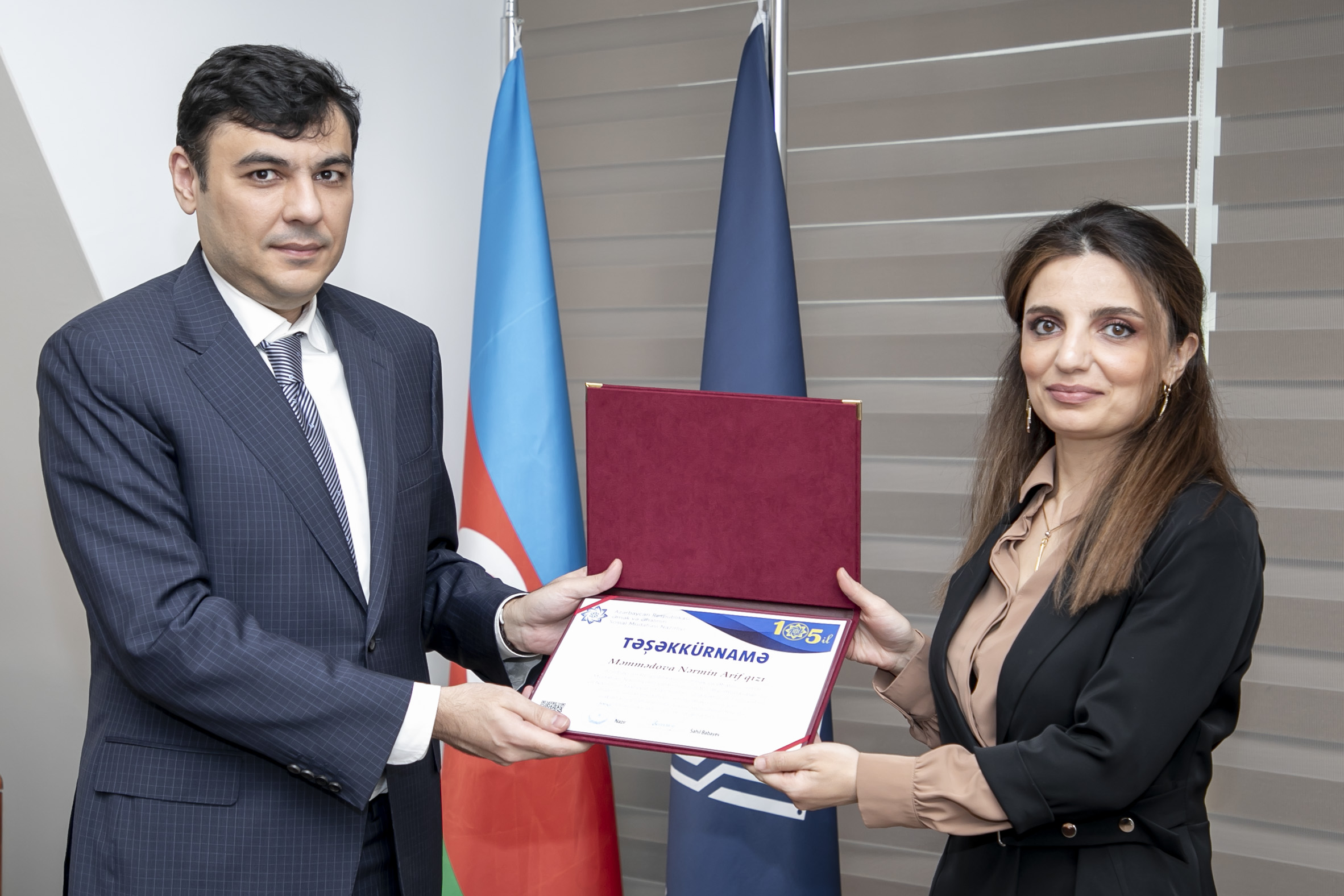 “Azərbaycan Respublikası Əmək və Əhalinin Sosial Müdafiəsi Nazirliyinin yaranmasının 105 illiyi münasibətilə və Nazirliyin fəaliyyət istiqamətləri üzrə səmərəli fəaliyyətinə, əhalinin sosial müdafiəsi, əmək, məşğlluq, pensiya reablitasiya sahələrində dövlət siyasətinin həyata keçirilməsində aktiv iştirakına görə” təltif edilənlər Abdullayev Mehman İsrayıl oğlu, Səlimova Təranə Adil qızı, Xaspoladov İsmət Qərib oğlu, Miriyev Hafiz Niftalı oğlu, Məmmədova Nərmin Arif qızı, Babayev Ənvər Niyaz oğlu, Məmmədov Məmməd Süleyman oğlu, Yusibov Kamil Ələmdar oğlu, Sultanov Amin Nizam oğludur.
