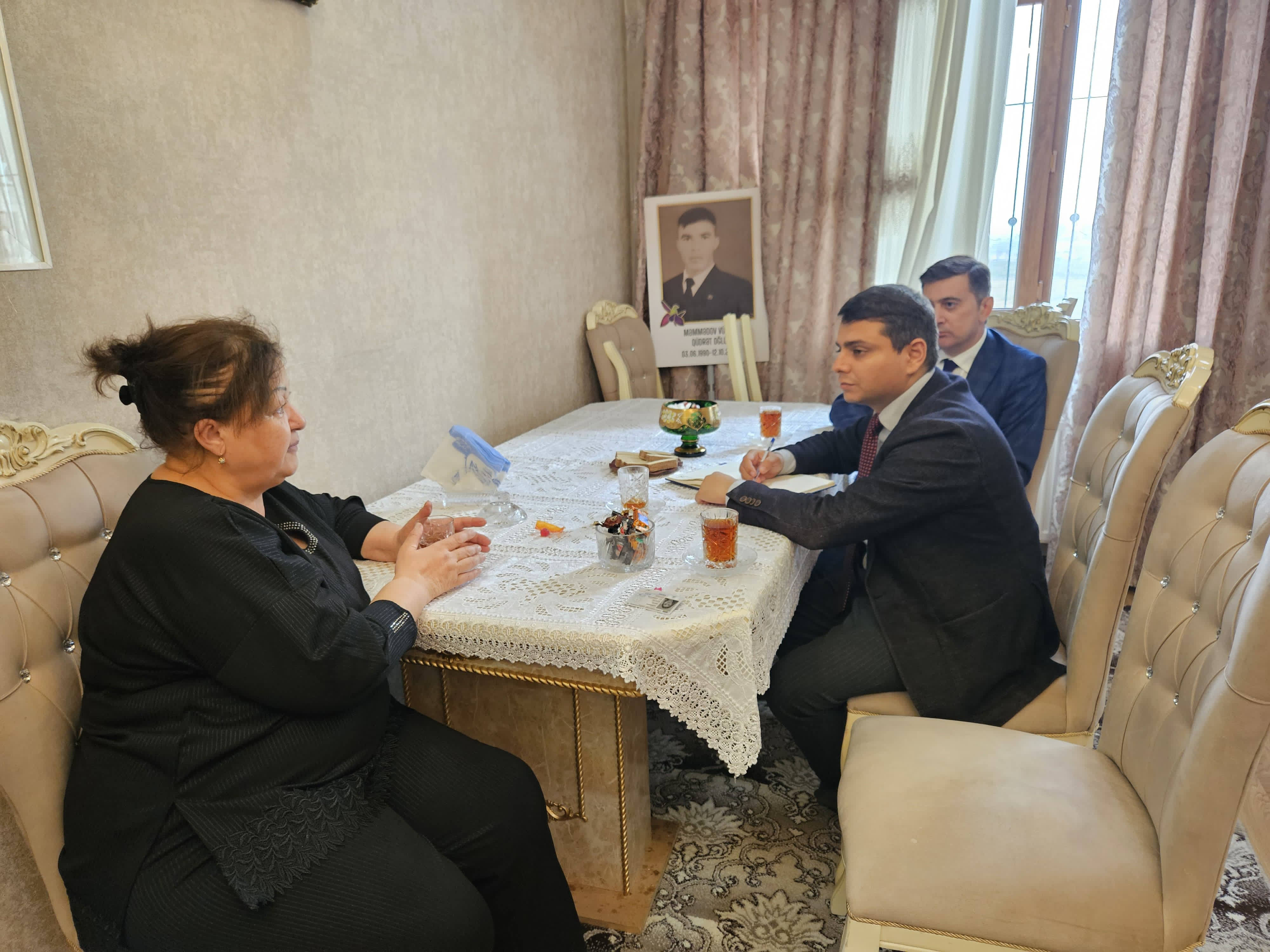Ailə ilə söhbət zamanı şəhidin keçdiyi şərəfli döyüş yolundan bəhs olunub, onun xatirəsinin əbədi olaraq yaşayacağı vurğulanıb. Xidmət əməkdaşları ailənin sosial vəziyyəti ilə maraqlanıb.