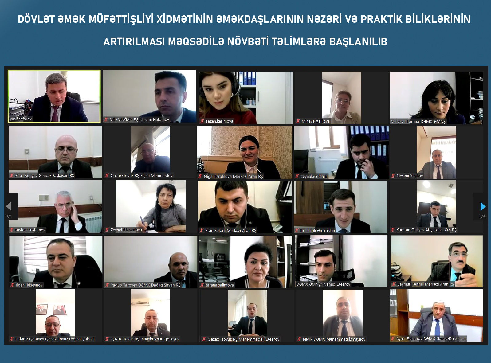 Bu dəfəki təlimlər “Əmək qanunvericiliyinin tətbiqi”, “Əməyin mühafizəsi”, “İnzibati Xətalar Məcəlləsinin tətbiqi”, “Əmək və Məşğulluq Altsistemindən istifadə” və “Sənəd Dövriyyəsi Alt Sisteminin tətbiqi və ondan istifadə” mövzularını əhatə edir.