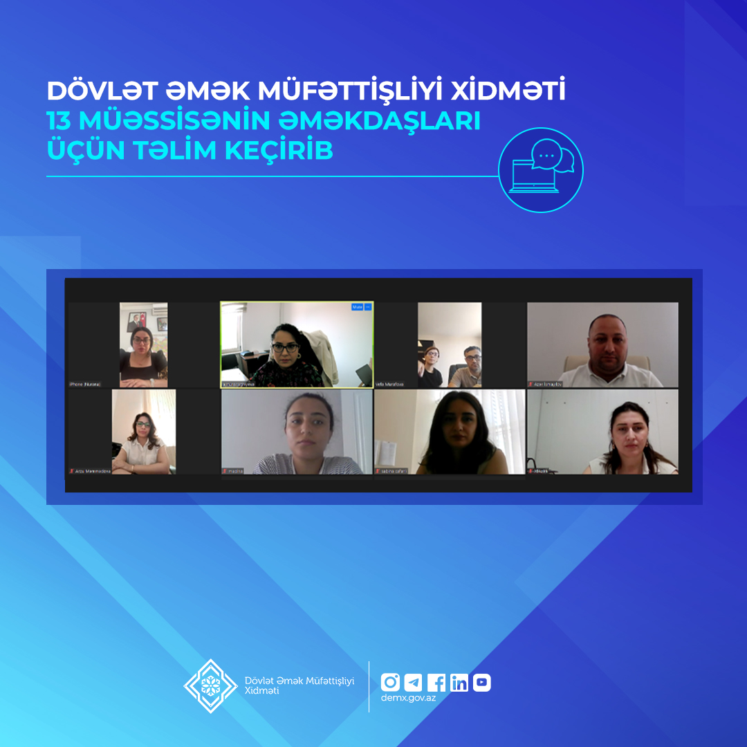 Bu tədbirlər çərçivəsində növbəti 13 müəssisə və təşkilatın əməkdaşları üçün yeni qanunvericiliyin tətbiqi ilə bağlı təlim keçirilib. Təlim zamanı yeni qanunvericilik aktları, əmək və məşğulluq sahələrində e-xidmətlərin genişləndirilməsi üçün normativ-hüquqi bazanın təkmilləşdirilməsi barədə ətraflı məlumat verilib.