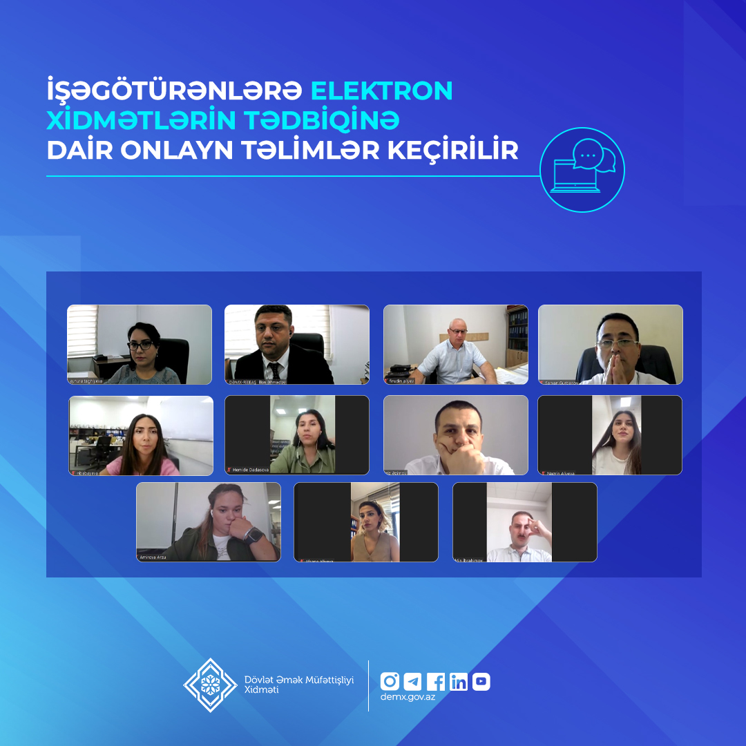Dövlət Əmək Müfəttişliyi Xidmətinin (Xidmət) Azərbaycan Respublikasının Əmək Məcəlləsinə edilmiş dəyişikliklərin, əmək və məşğulluq sahələrində elektron xidmətlərin tədbiqinə dair təşkil etdiyi onlayn təlimlər davam etdirilir.