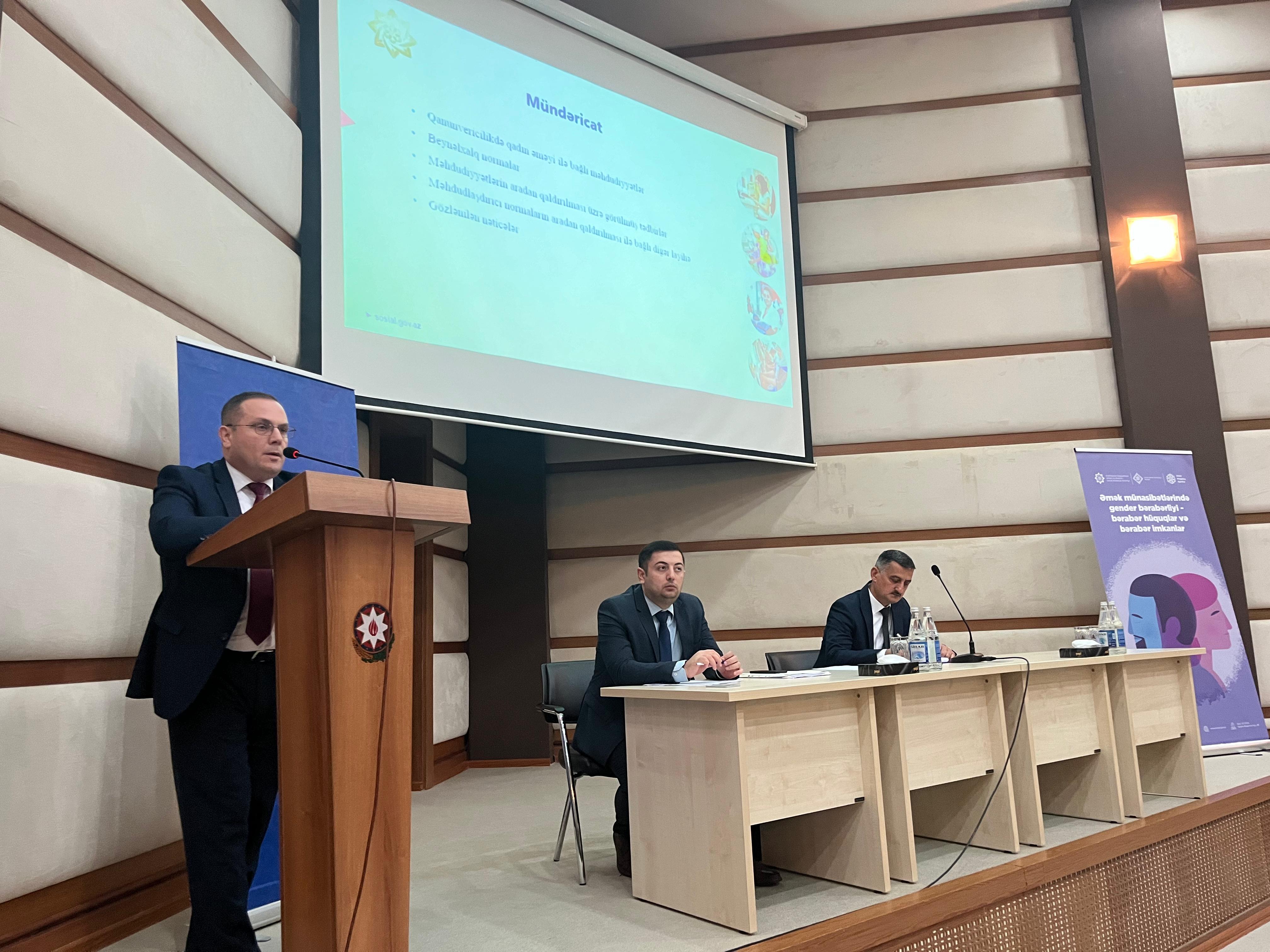 Əmək və Əhalinin Sosial Müdafiəsi Nazirliyinin Əmək siyasəti şöbəsi, Nazirlik yanında Dövlət Əmək Müfəttişliyi Xidməti və Dövlət Məşğulluq Agentliyinin təşkilatçılığı ilə təşkil olunan tədbirlər “Əmək münasibətlərində gender bərabərliyi-bərabər hüquqlar və bərabər imkanlar” mövzusunda olub.