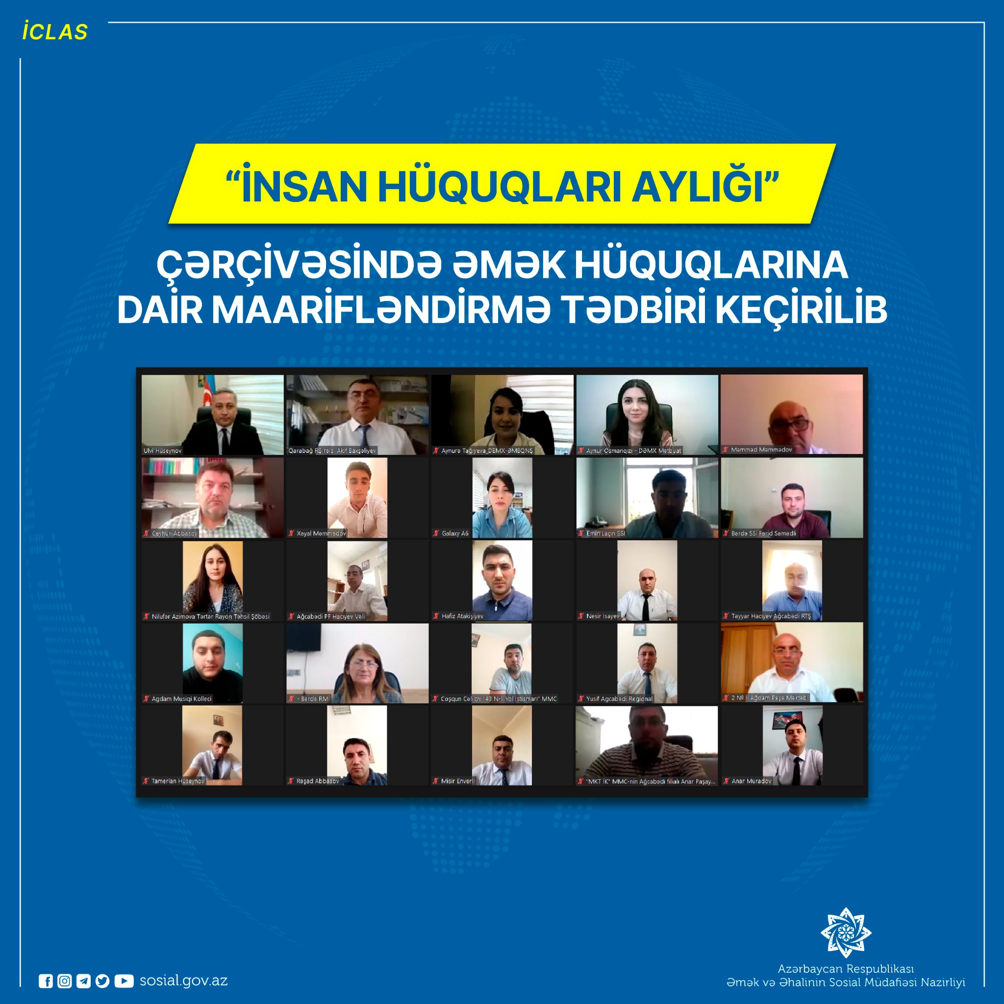 Əmək və Əhalinin Sosial Müdafiəsi Nazirliyi yanında Dövlət Əmək Müfəttişliyi Xidməti 18 İyun - İnsan Hüquqları Günü ilə əlaqədar elan olunmuş “İnsan hüquqları aylığı” çərçivəsində əmək hüquqlarına dair onlayn maarifləndirmə tədbiri keçirib.