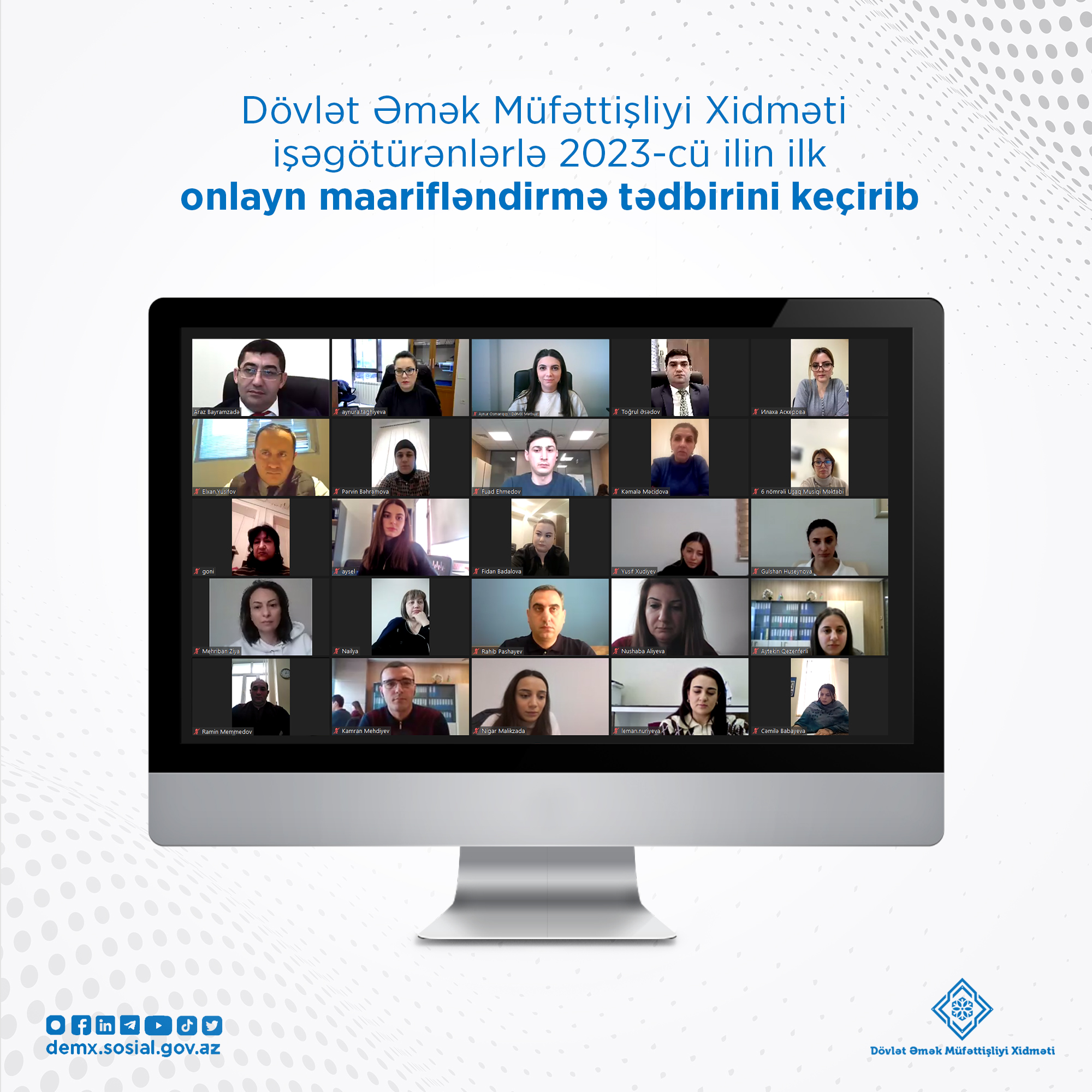 Əmək və Əhalinin Sosial Müdafiəsi Nazirliyi yanında Dövlət Əmək Müfəttişliyi Xidməti işəgötürənlər üçün "ƏMAS-ın imkanları və yeniliklər" mövzusunda cari ilin ilk onlayn maarifləndirmə tədbirini keçirib.