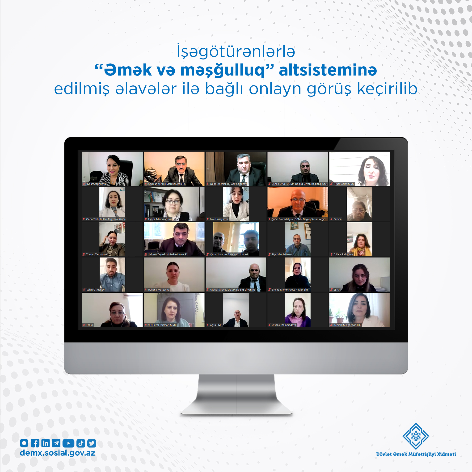 Əmək və Əhalinin Sosial Müdafiəsi Nazirliyi yanında Dövlət Əmək Müfəttişliyi Xidməti tərəfindən “Əmək və məşğulluq” altsisteminə edilmiş əlavələr ilə bağlı onlayn təlim bu dəfə Dağlıq Şirvan, Mərkəzi Aran və Quba-Xaçmaz regionlarının işəgötürənləri üçün təşkil edilib.